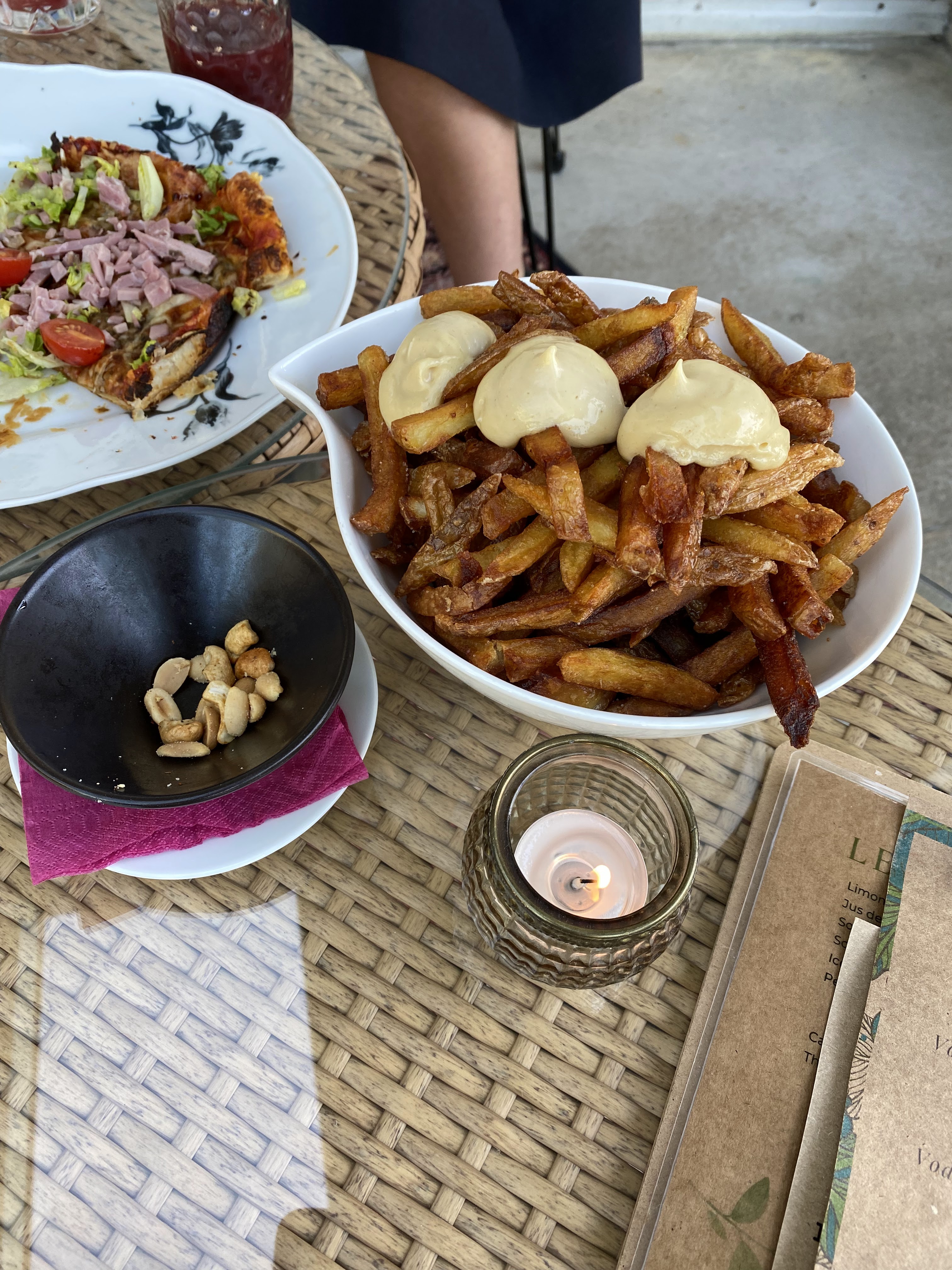 Une cour ombragée très sympa, une décoration originale, des serveuses et serveurs dynamiques et agréables, une cuisine délicieuse. Je recommande vivement et reviendrai avec plaisir !