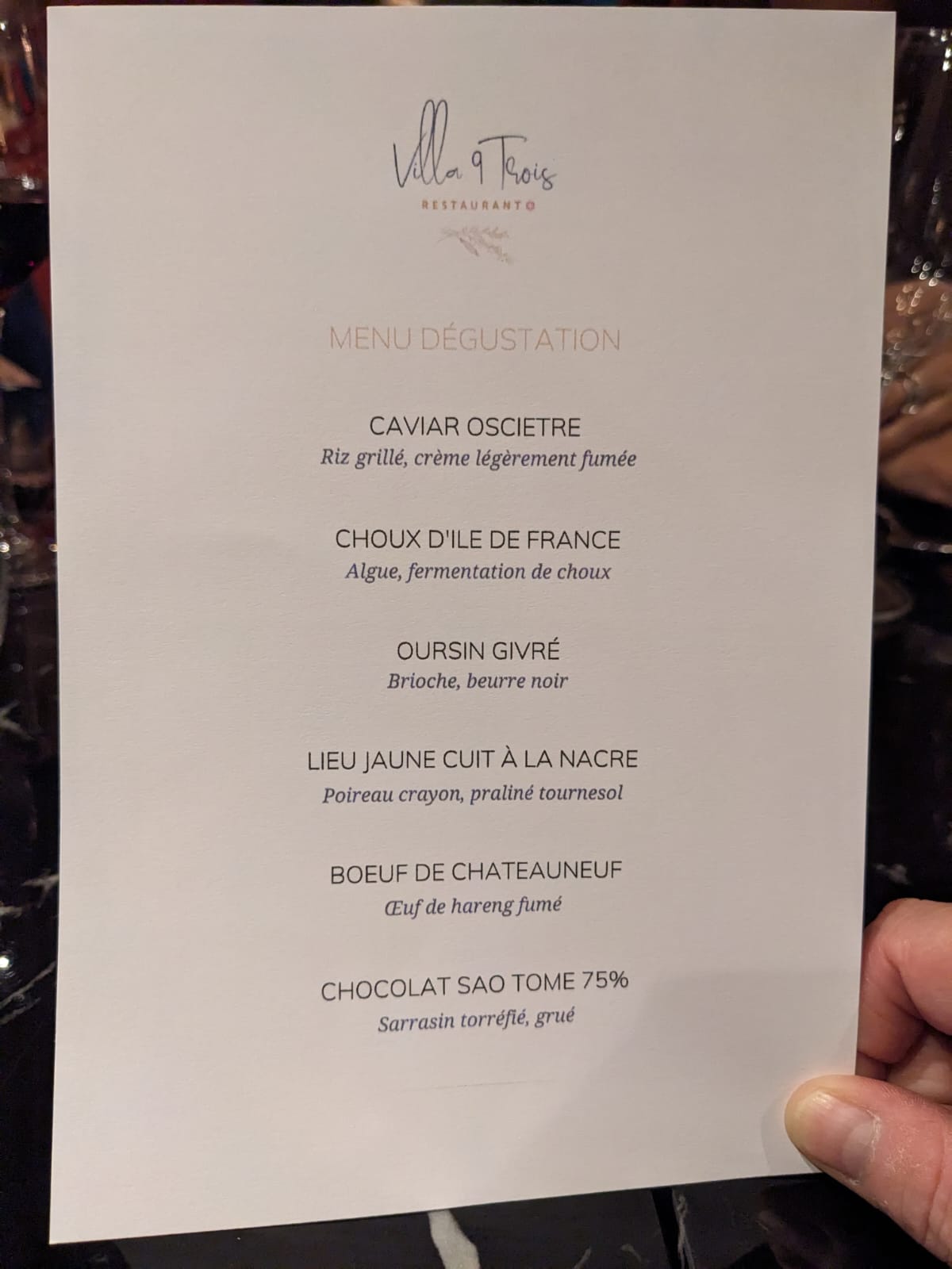 Nous sommes allés en famille a Villa9Trois pour un dîner d'anniversaire. Le menu dégustation était excellent, avec ce que nous attendons dans cette categorie de restaurant a savoir, des surprises, des découvertes et du plaisir partagé bien sûr. Le service et les serveurs sympathiques et efficaces, ça déroule sans problème. Une bonne soirée de l'avis de tous Merci a l'équipe