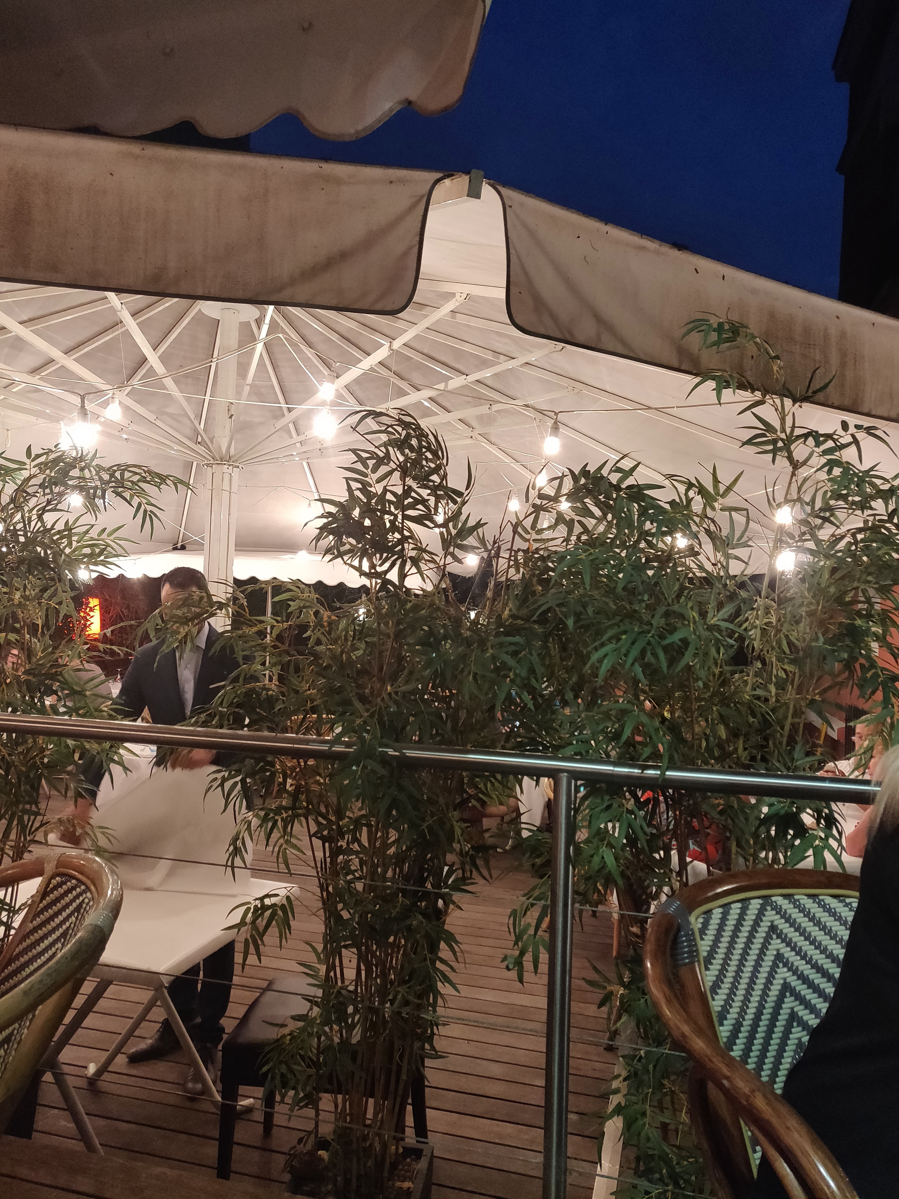 Terrasse merveilleuse. Service impeccable et cuisine raffinée. Entrée foie gras, demi homard en rouleaux de printemps... Les plats au choix sont délicieux. Et les desserts à tomber.(éclair façon macaron). Ajouter à cela une belle carte des vins et surtout une superbe cave de rhum de collection . Surprenant courez y!
