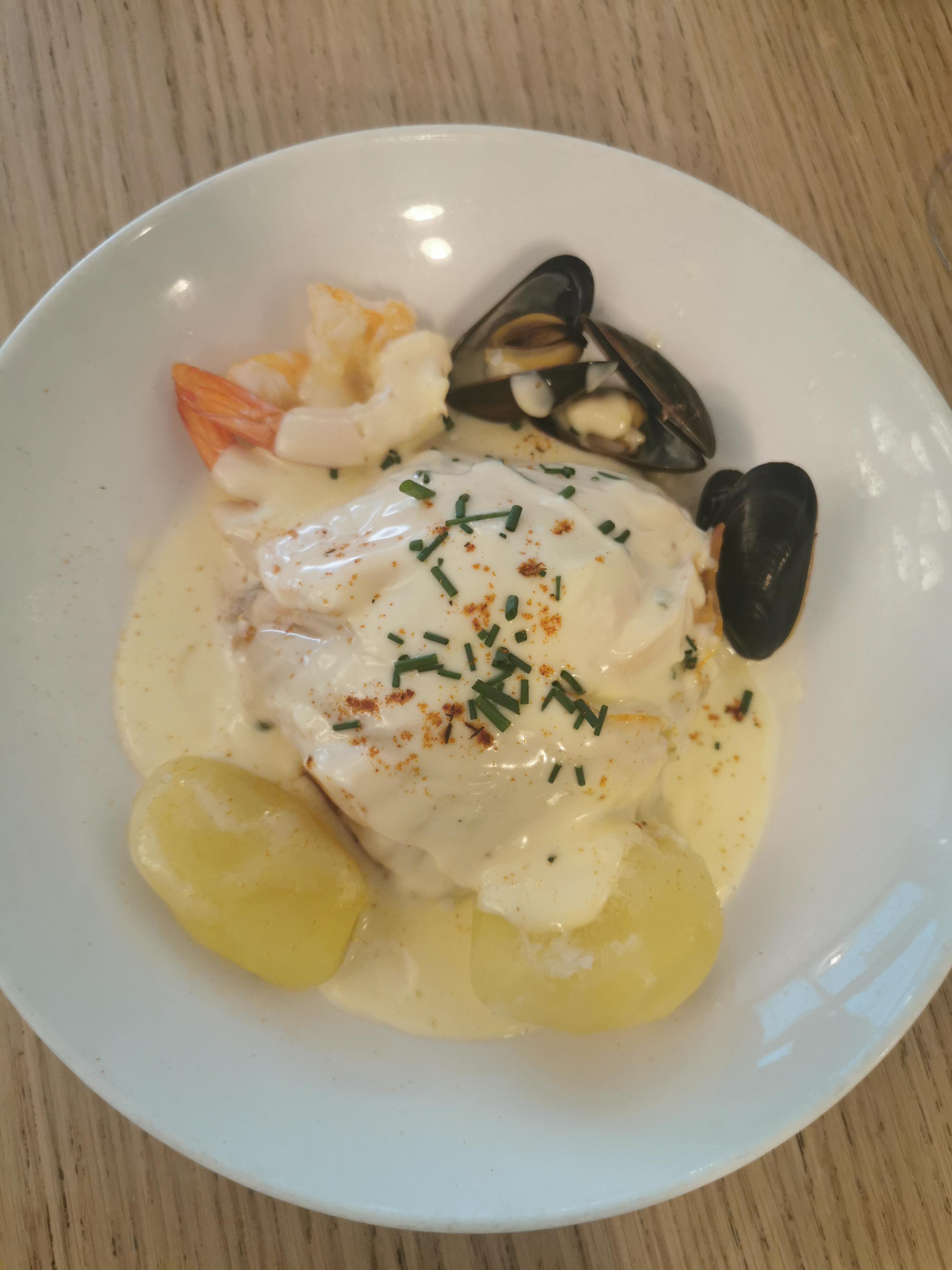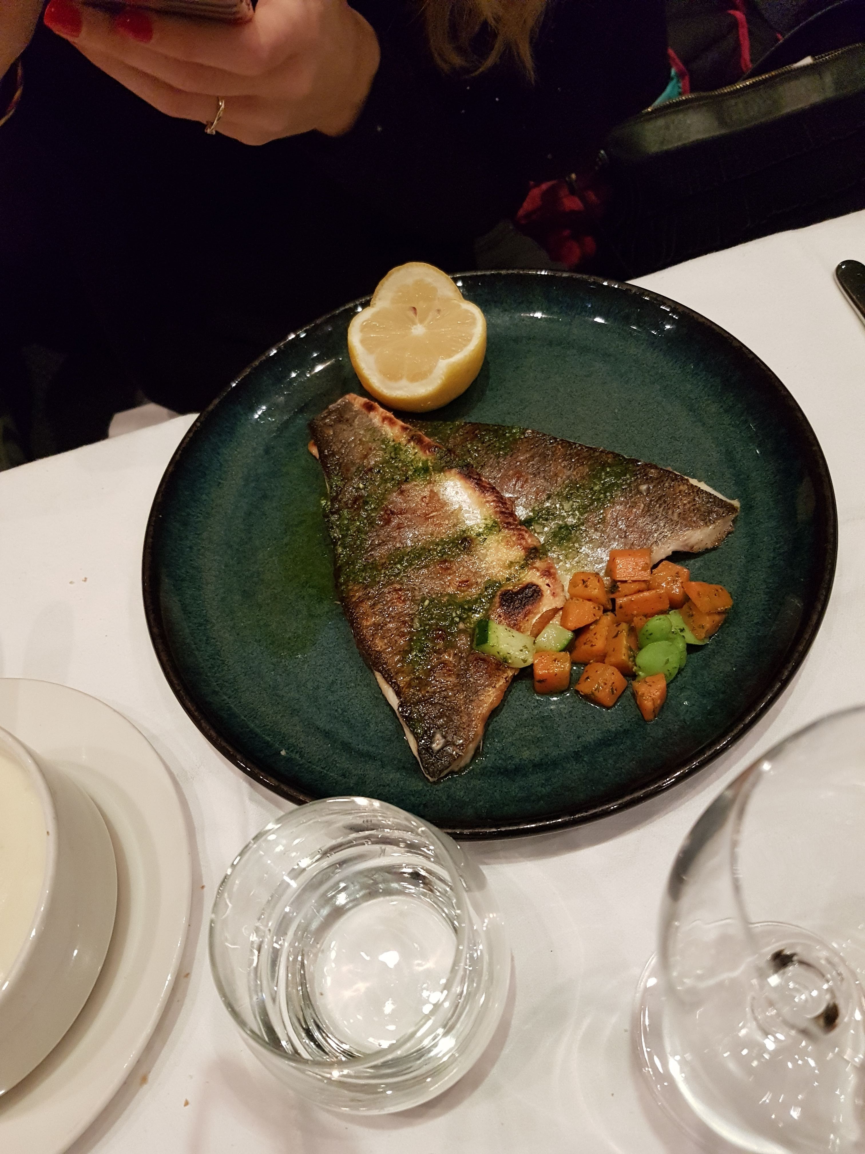 Très bon bar grillé aux légumes vapeur (mon compagnon) mais déçue par le fish & chips. Je m'attendais à du cabillaud comme à Dublin et j'ai eu des nuggets de poisson (pas de filet, du poisson haché), frites pas assez croustillantes. Dommage car l'accueil est très sympathique !