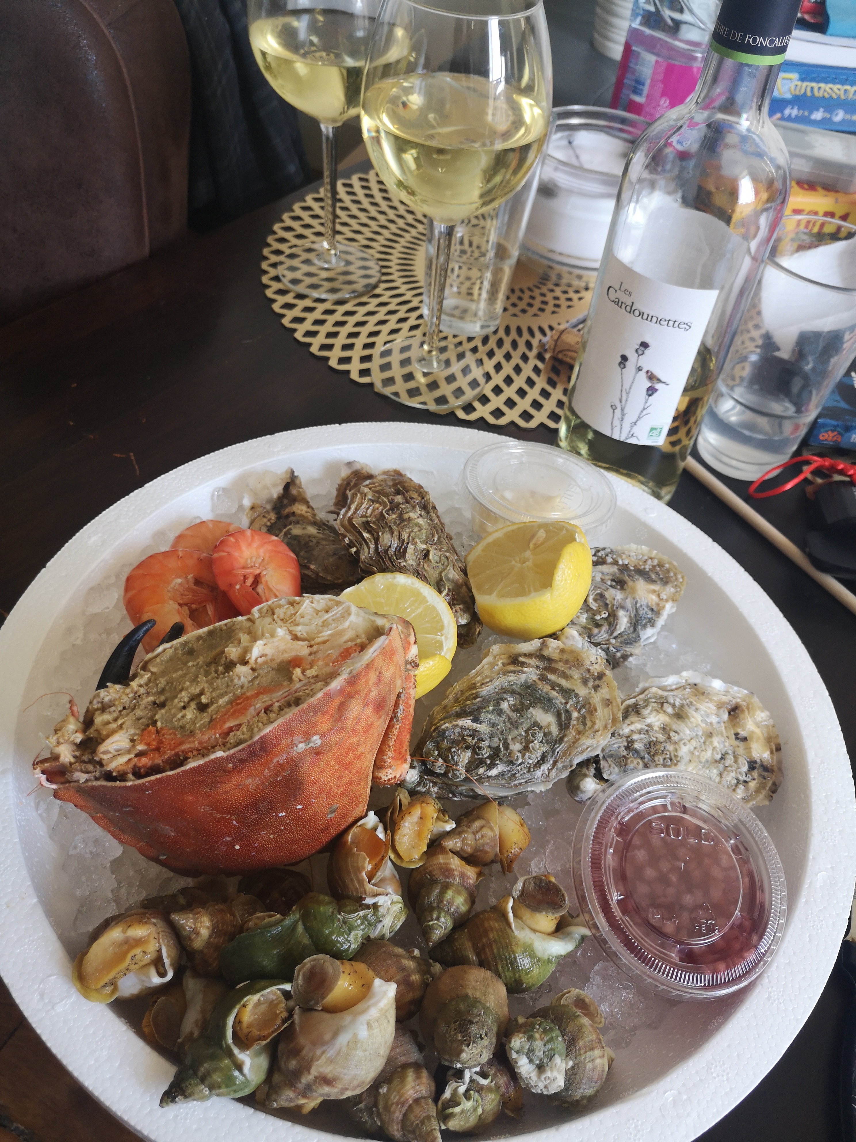Service un peu long, mais ça valait la peine d'attendre : 2 superbes plateaux de fruits de mer, ultra frais et copieux pour 5 personnes. Un régal, le tout pour un prix très raisonnable... je recommande à 100%