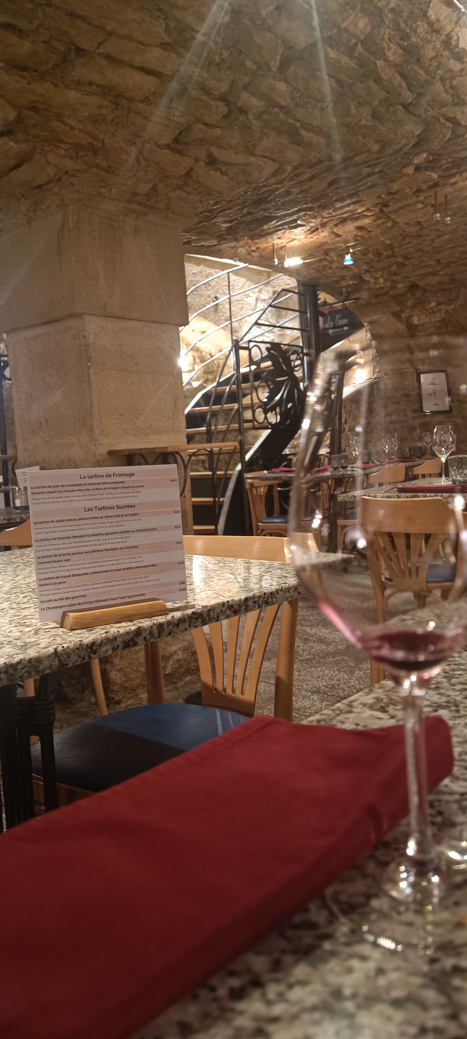 Bon accueil dans un magnifique cadre : cave voûtée. Très bonnes tartines, la garniture remplace le pain 👌, très bons vins pour les accompagnées et jus de raisin. Tartine sucrée aux pralinés délicieuse 😍 Mention spéciale pour le serveur Jean-Baptiste nous avons passé une très bonne soirée ! Nous reviendrons lors de notre prochain séjour 😉