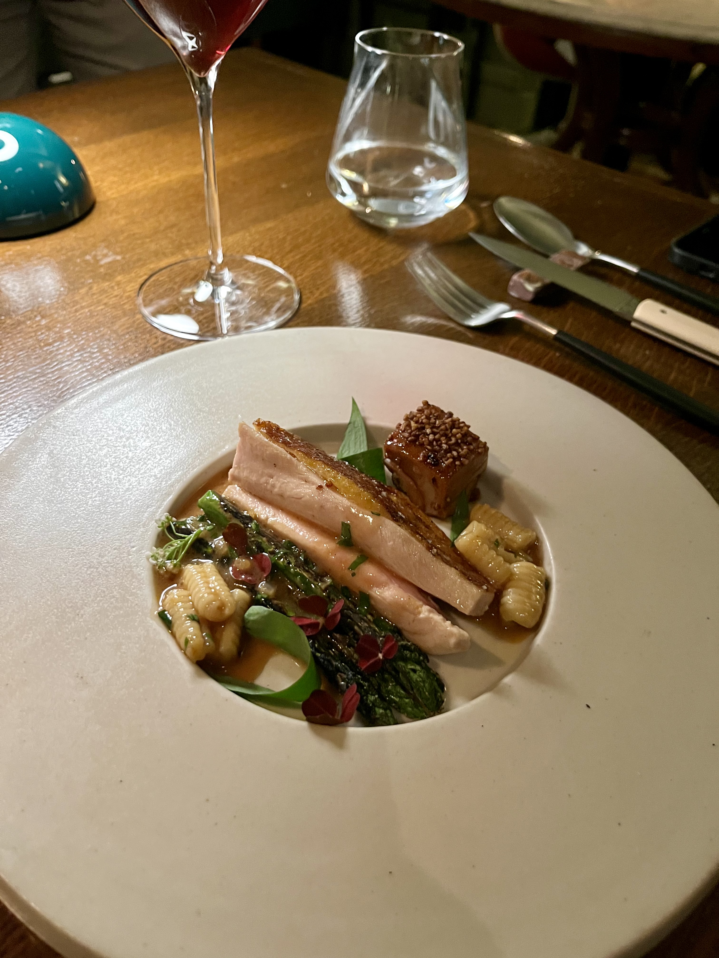 Un moment parfait. Tout est précis, agréable, attentionné, parfaitement équilibré. Juste ce qu’il faut d’innovation alliée à la simplicité. Cela vaut pour la déco, le service, la cuisine et les vins.