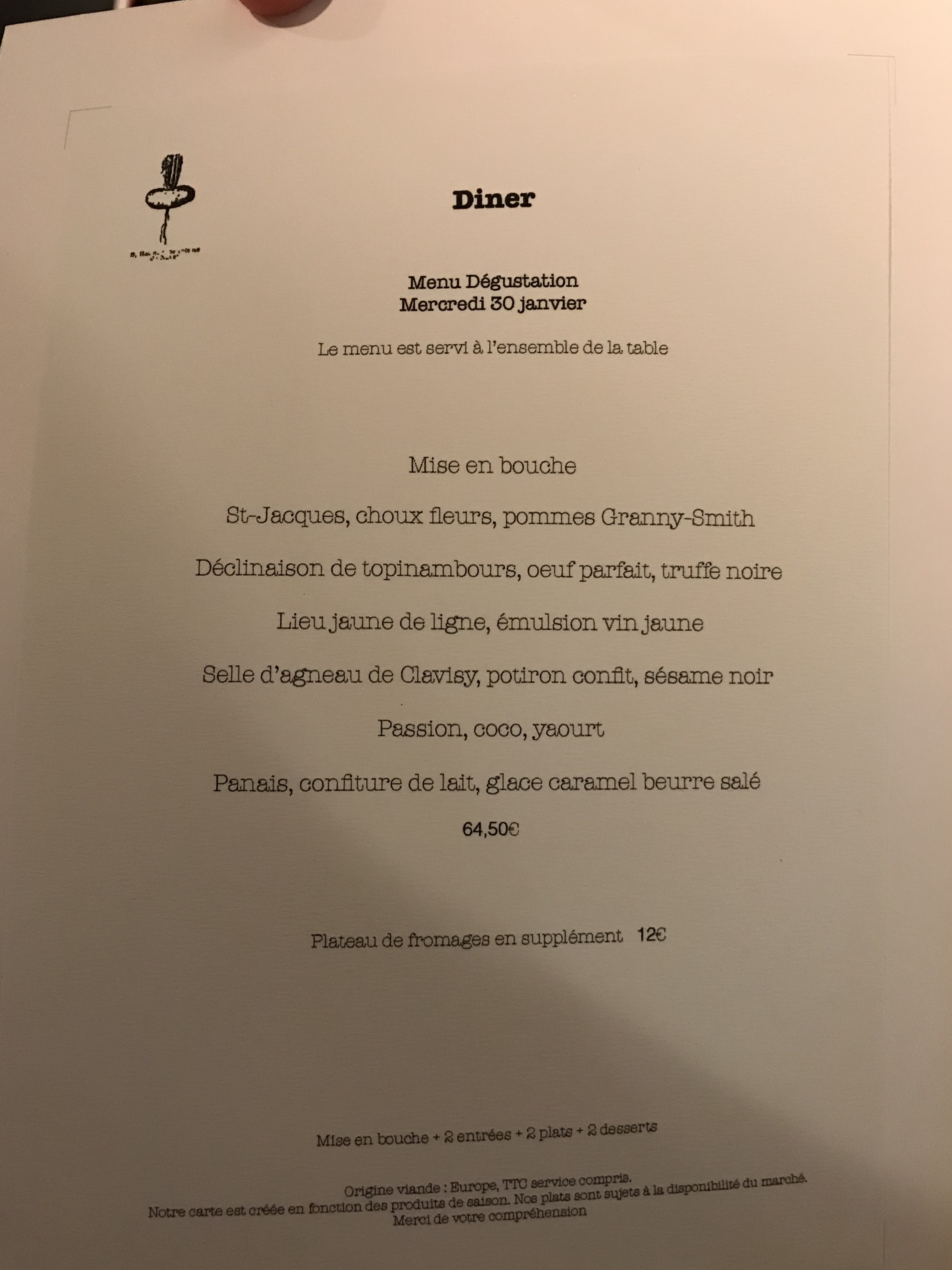 Soirée très agréable, tous les plats étaient d'une grande finesse très riche en saveur et de valeur égale. Difficile de dire ce que l'on a préféré. La présentation des plats fait avec clarté et avec humour. Petit bémol sur le service des eaux et du vin, fait de façon un peu brutale et sans se preocuper de l'aval du convive. (versement d'un beaune dans un verre contenant un meursault)