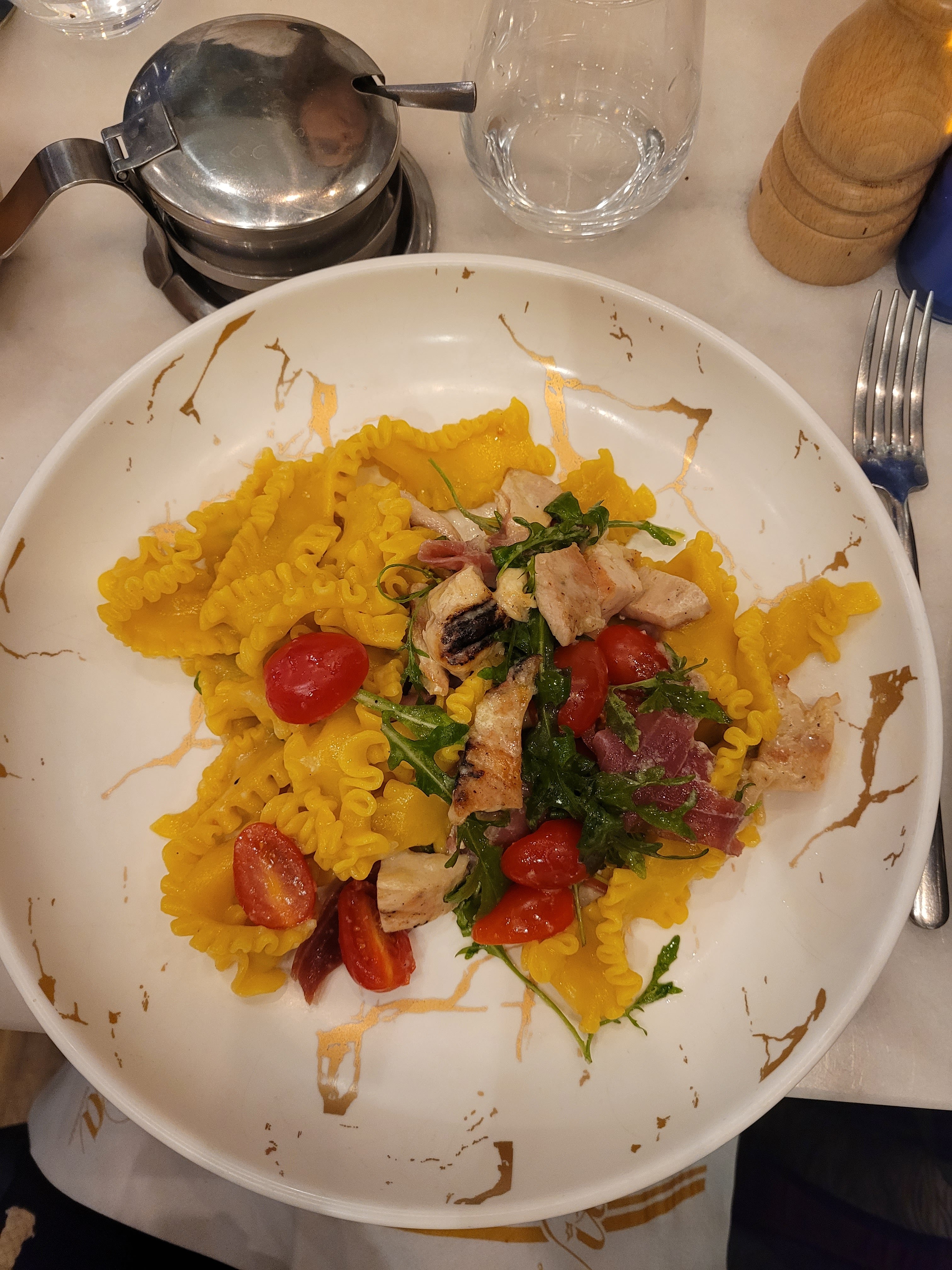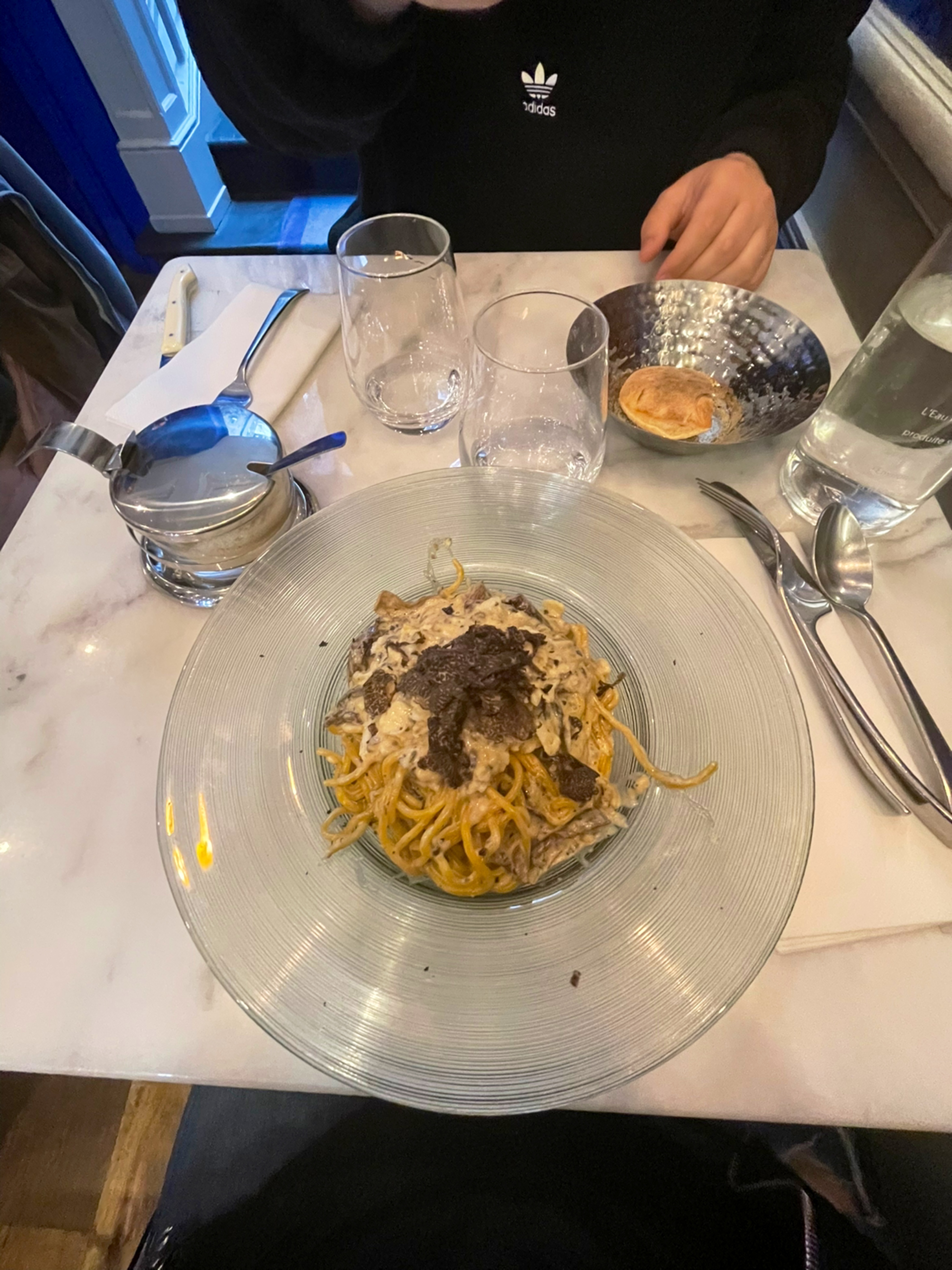 Pâtes à la truffe bonne mais portion assez petite pour le prix, les pâtes n’étaient pas assez fondante: un peu trop cuit tout comme le jambon de parme très dur en bouche. Grand bémol pour le service, on nous a facturé l’eau (5€), alors que nous avions demandé une carafe. Le serveur est arrivé avec une bouteille et nous a directement servi au verre.. la bouteille étant déjà ouverte: il était trop tard pour contesté.. très moyen