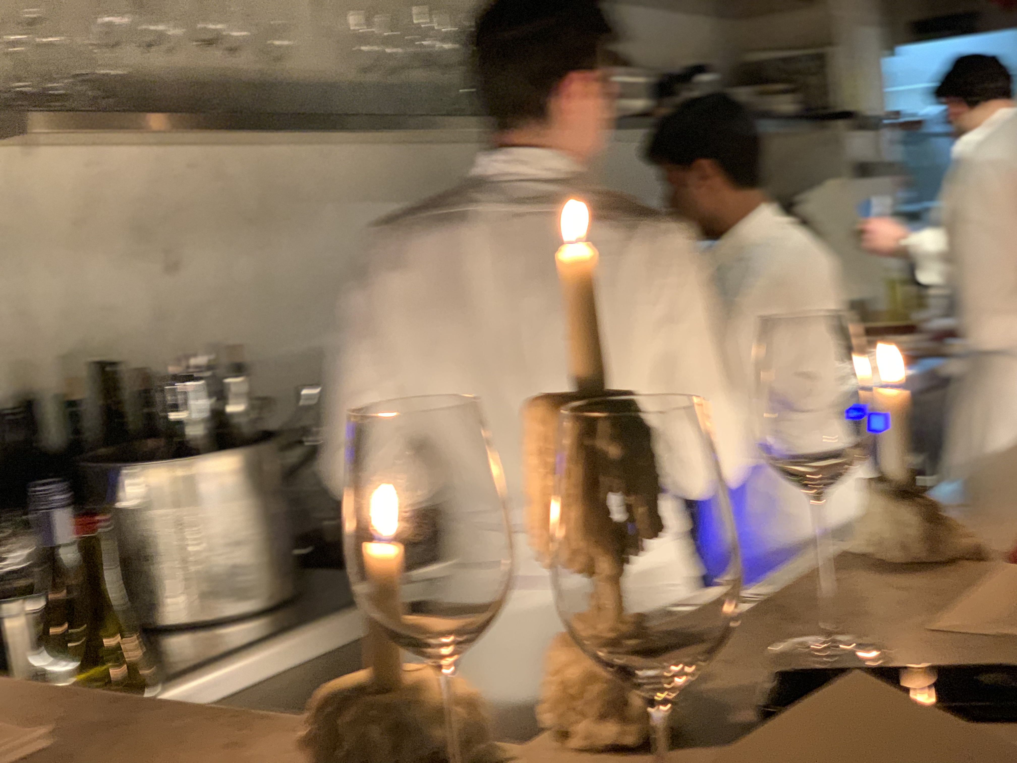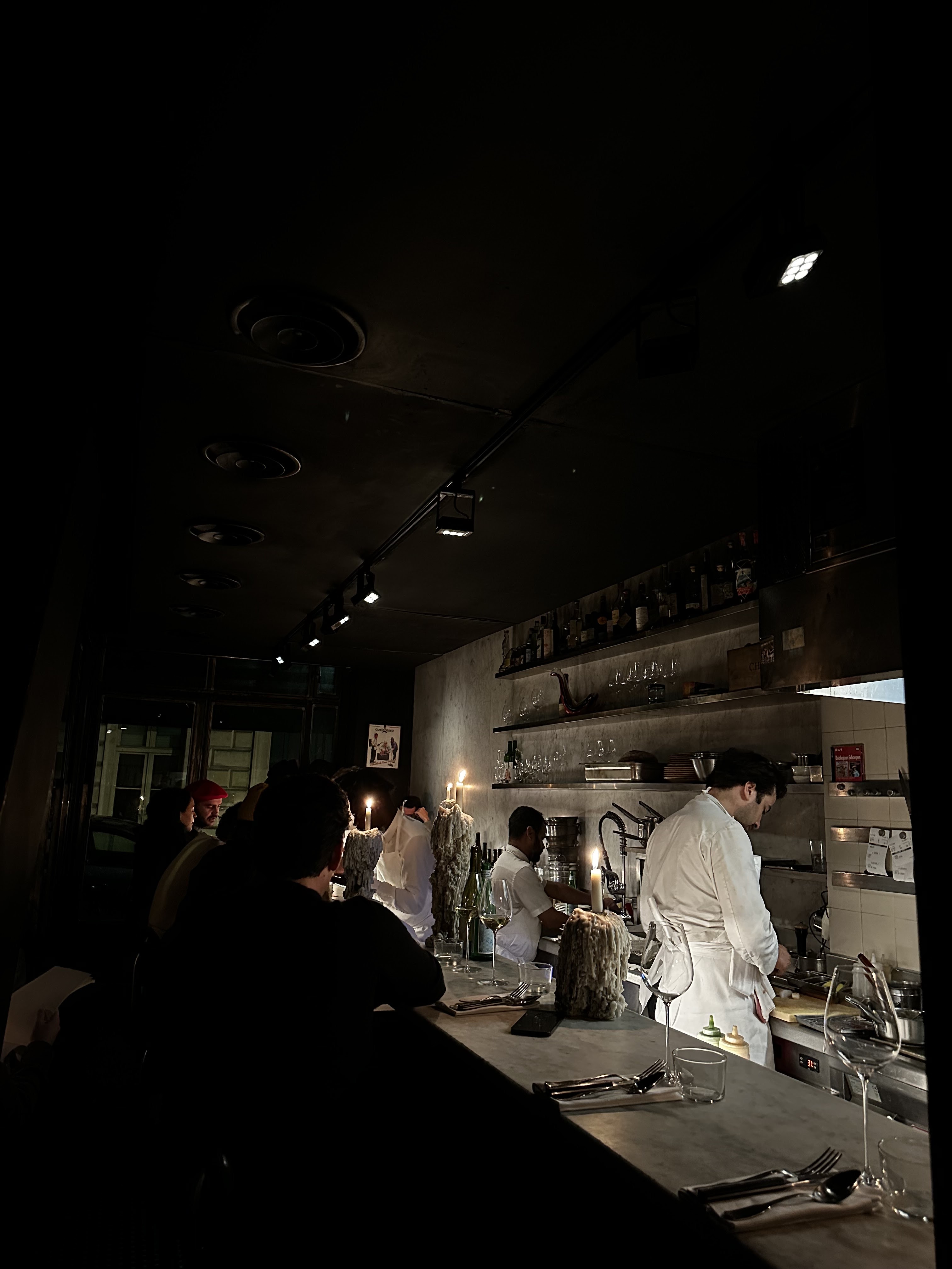 Il faut être honnête sur le lieu : salle de restaurant très atypique qui vous permet de dîner sur le comptoir et donc avec une vue direct sur la cuisine. La cave à vins fait la longueur du comptoir et donne un sacré look. Le dîner se fait à la bougie. Les serveurs sont attentionnés. Au final, on doit être une dizaine de personnes à manger dans le restaurant. Tout ça est positif. Concernant la carte des vins : les prix sont totalement disproportionnés par rapport au lieu. La plupart des vins coûtent entre 80 et 200 euros. Il y a des pointes à plus de 300 euros la bouteille. Sur les nombreuses pages de la carte des vins, j’ai du trouver 3 vins entre 44 et 55 euros. On a bu un Beaujolais réglementaire. Pour information la demi bouteille (50cl) de San Pellegrino est à 6 euros (aucun autre format proposé). Pour le repas : Il y a une carte à l’extérieur du restaurant qui ne correspond pas du tout aux prix pratiqués. Si vous voulez vous rassasier de façon normale, il faudra compter plus de 80 euros par personne (hors boisson) pour une cuisine que vous auriez pour moins cher chez un étoilé ou un bon bib. C’est dommage, le restaurant joue sur le packaging. Nous avons été choqués par un point. Nous avons pris deux pigeons à 37 euros le plat. Le plat est préparé devant vous. Le filet du pigeon est levé de sa carcasse et mis dans l’assiette. Le reste de la carcasse est mis à la poubelle devant vous (vu sur deux préparations). On en fait quoi des cuisses / pattes (poubelle) ? Quel gaspillage d’enfants gâtés ! Aucun légumes ou féculents dans l’assiette. Heureusement qu’il y avait un morceau de pain… Il en manque vraiment dans l’assiette. C’est dommage, l’équipe est sympa, le concept de base pourrait être bien mais le reste est totalement à revoir. Une drôle de sensation entre le restaurant pour touristes friqués et un restaurant qui est complètement passé à côté de ceux qu’il veut transmettre. A revoir, mais pas pour nous. En sortant du restaurant, nous sommes allés manger une planche de charcuterie / fromages dans un autre établissement.