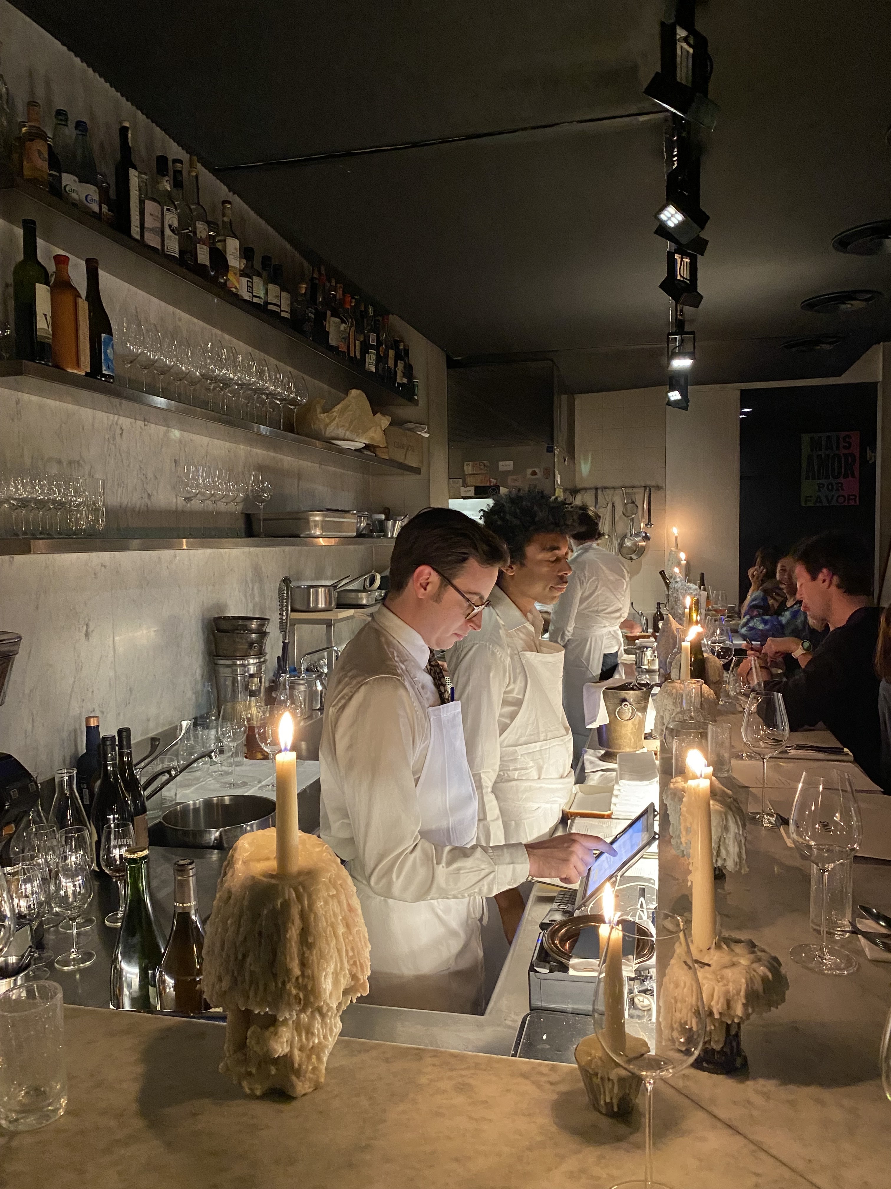 Tout y est parfait, ou presque. Des équipes drôles et accessibles, des mets fins et délicieux, une carte de vin originale. Seules les tables sont rares, et il faut aimer dîner au comptoir. A part ce détail, on est proche de la perfection.