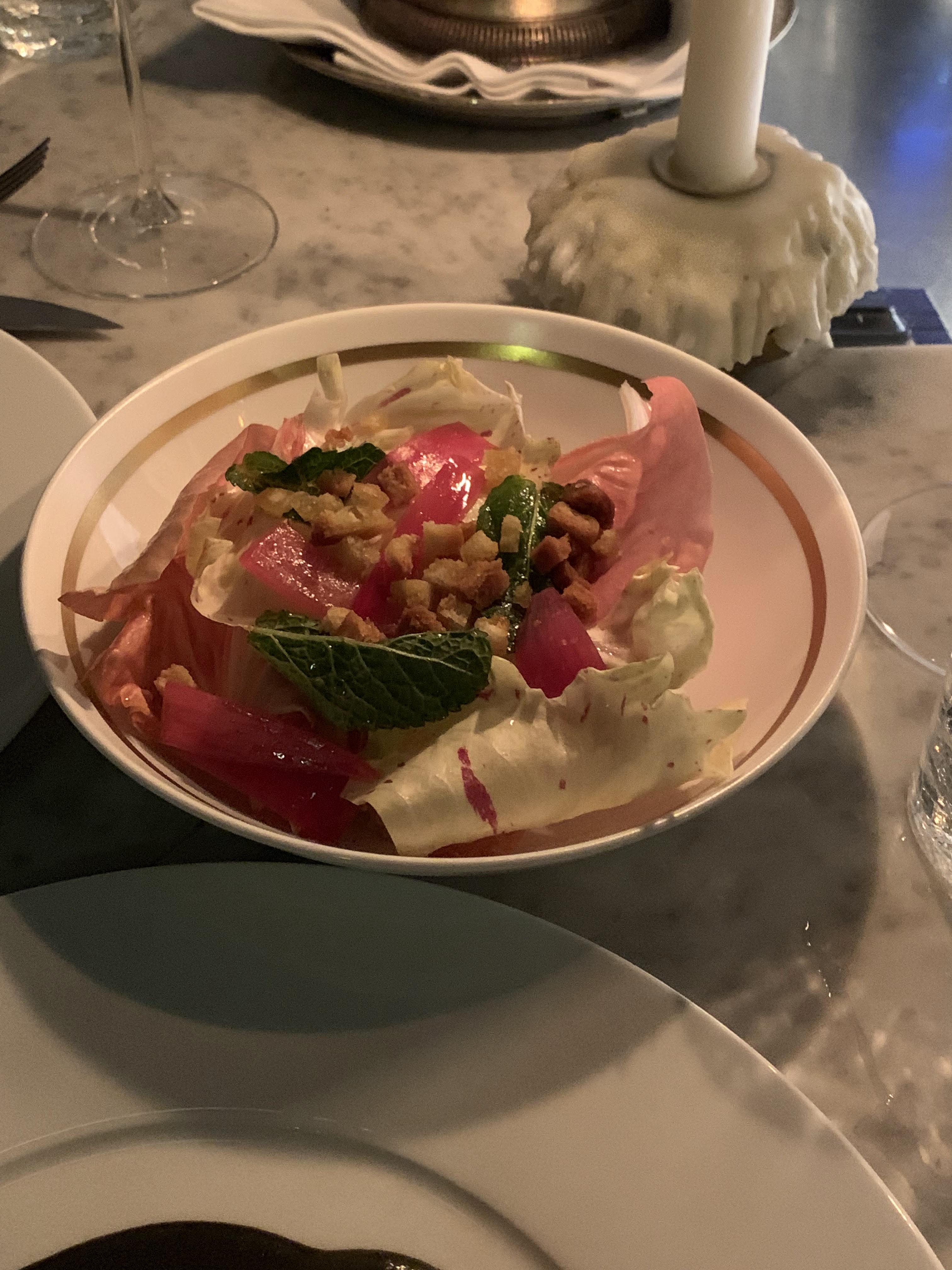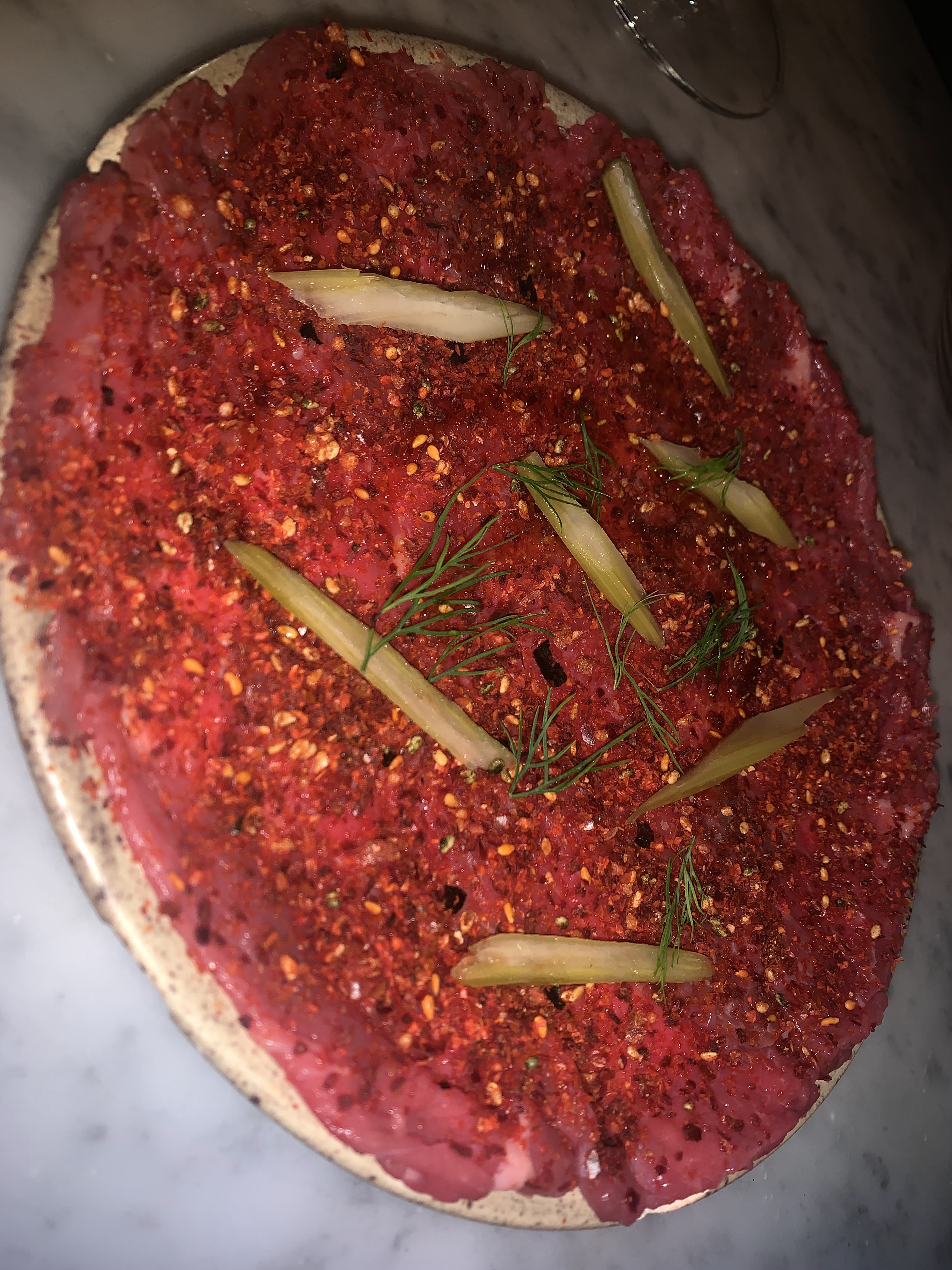 Tous les plats étaient extrêmement savoureux, surtout la viande ! J'ai également aimé la taille des portions car elles ne sont pas petites - nous n'avons même pas pris de dessert. Seul le pain n’était pas le meilleur que nous ayons eu pendant notre week-end. Carte des vins écrasante si vous me demandez - mais les vins au verre étaient très bien choisis. Après avoir lu les critiques, nous attendions (trop ?) beaucoup de la bonne ambiance. Même si nous avons adoré notre playlist, les invités étaient très occupés avec eux-mêmes et le personnel que je décrirais comme sympathique et professionnel plutôt que de véritablement s'occuper des invités.
