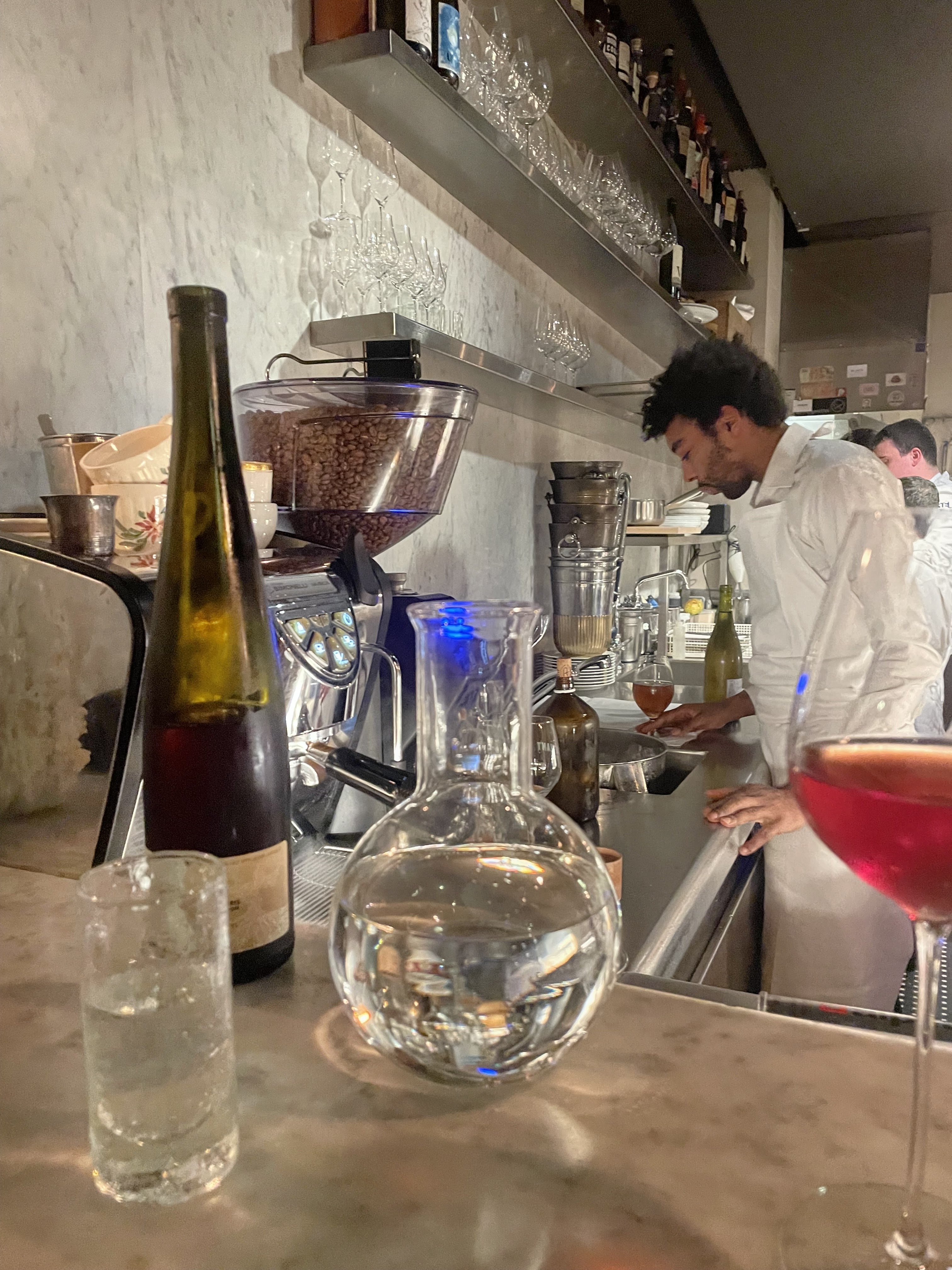 Il faut arriver tôt pour trouver une place sur le beau comptoir en marbre, puis laisser parler les garçons au comptoir pour choisir le bon vin (nature), et se laisser tenter par un mezze, ce soir là un caviar d'aubergine divin, pain divin et vin tout aussi délicieux ! J'ai promis de revenir pour goûter le vin orange et les accras ! J'ai hâte !!