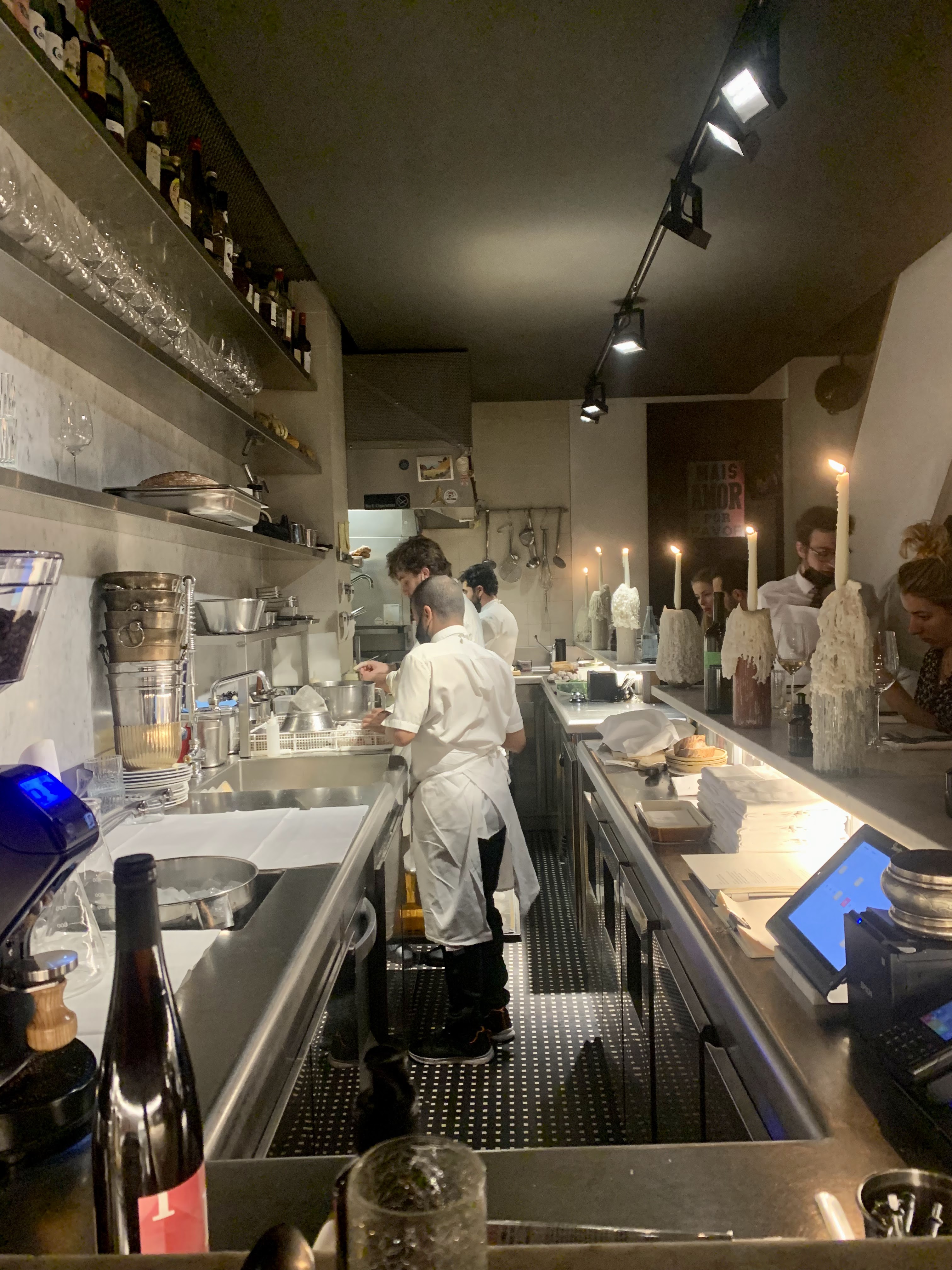 13/04/22. Expérience incroyable! Nous commençons par être accueillis dans cette atmosphère petite mais vibrante, avec de la musique des années 90 toute la nuit, ce qui à mon avis est fantastique ! Nous sommes placés juste en face des cuisiniers, ce qui était pendant toute la soirée assez synchronisé et intriguant à regarder. Je recommande vivement ce restaurant pour sa bonne cuisine, son ambiance et son personnel serviable et gentil ! Alors si vous aimez les vins Bio, alors foncez ! Je ne suis pas moi-même un adepte à 100% des vins Bio, mais ici tout était satisfaisant. Je vous recommande bien sûr de ne pas être plus de 2 personnes, car alors l'intérêt de manger au bar près des chefs serait impossible.