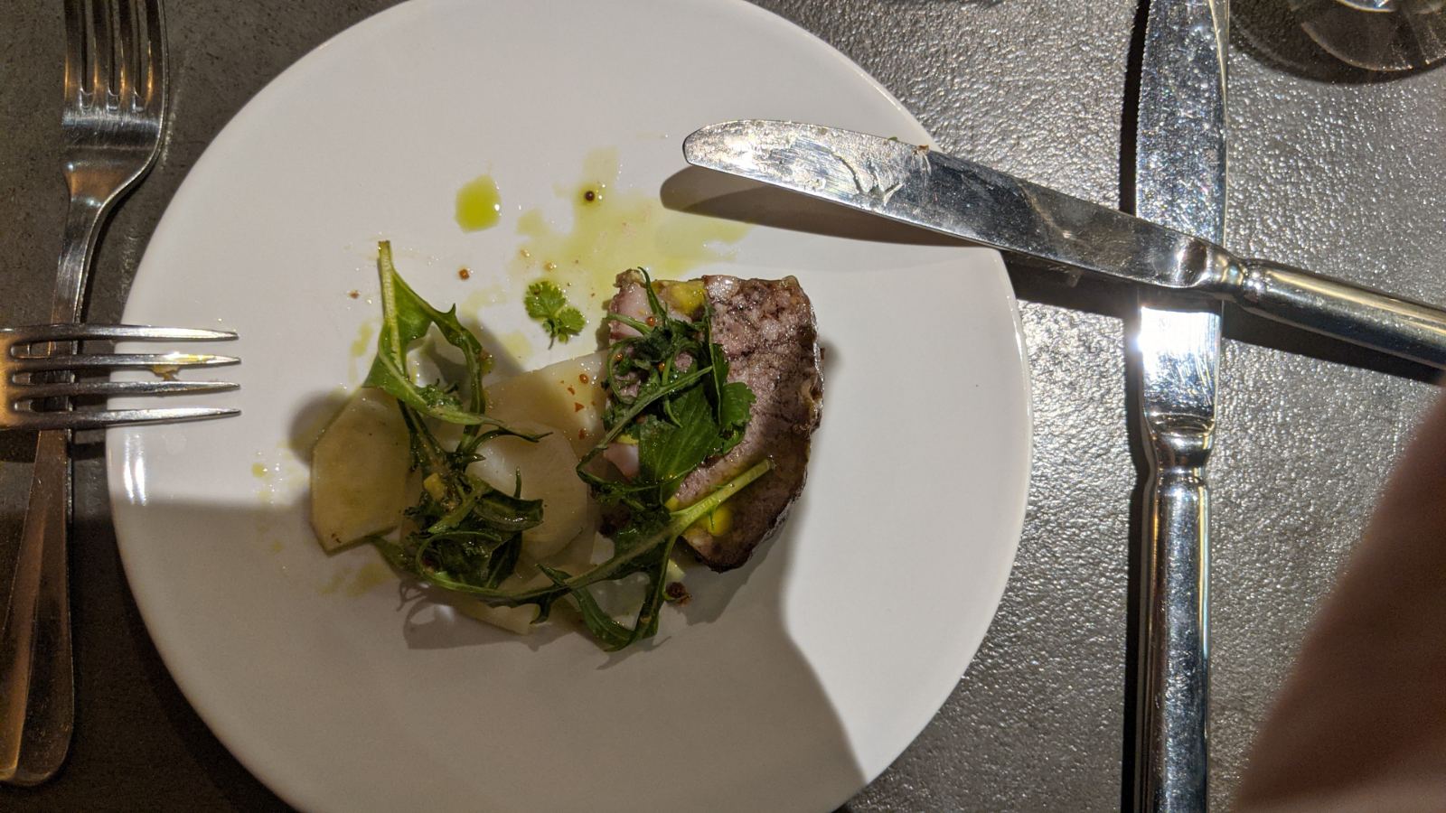 Le plat arrive, on croit que c'est une entrée tellement la quantité est ridicule (pour 21 euros quand même !). Idem pour le dessert. Heureusement, il y avait un morceau de pain... Une jolie présentation, des plats plutôt bons, mais il ne faut pas exagérer !