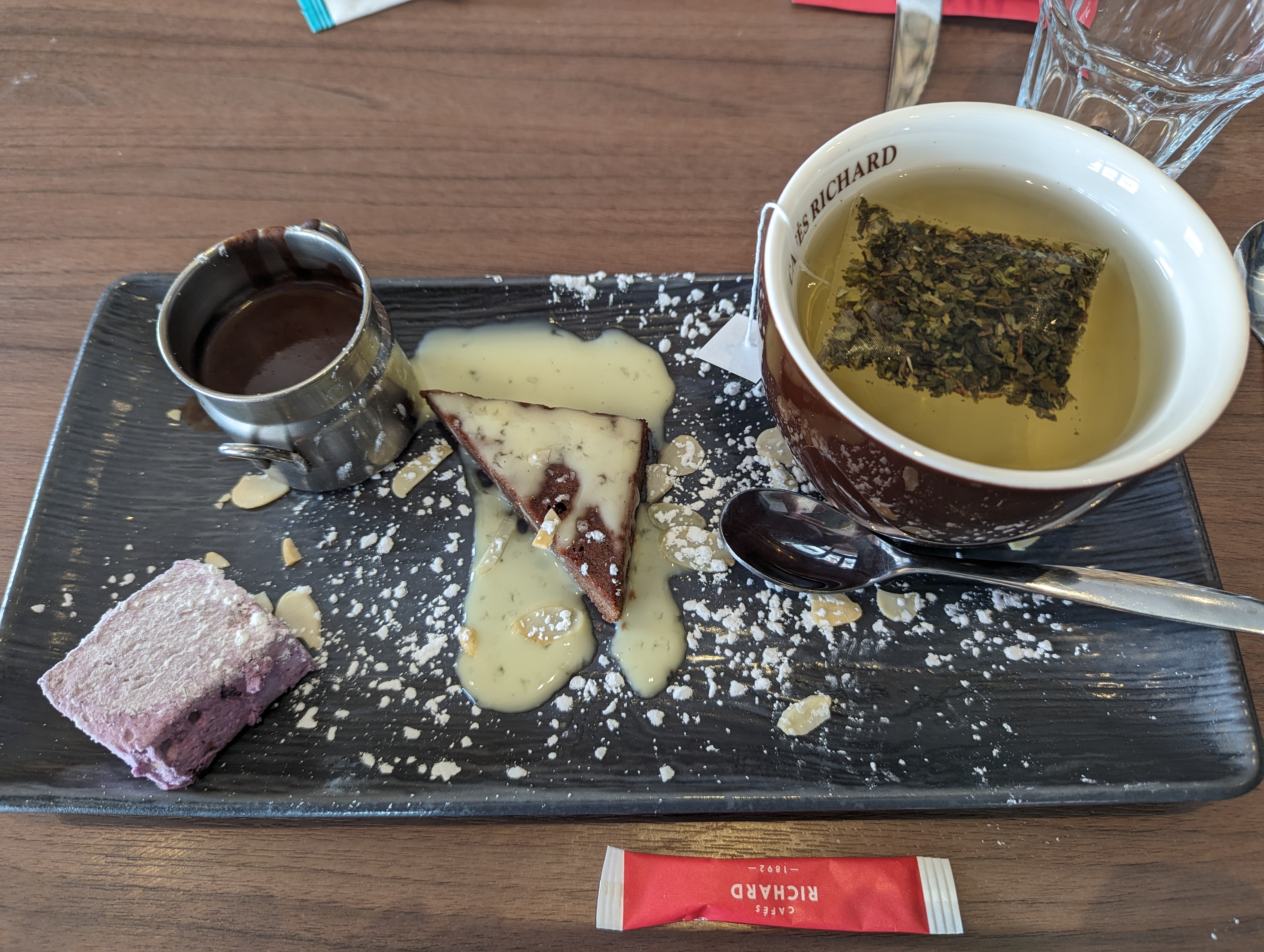 Nous avons juste pris 2 vins chaud et un thé a boire dehors. Le vin chaud était bon mais le service est déplorable. Le serveur était antipathique. Un autre ami a nous a été chercher un autre vin chaud un peu plus tard et a lui aussi eu droit a un traitement désagréable.