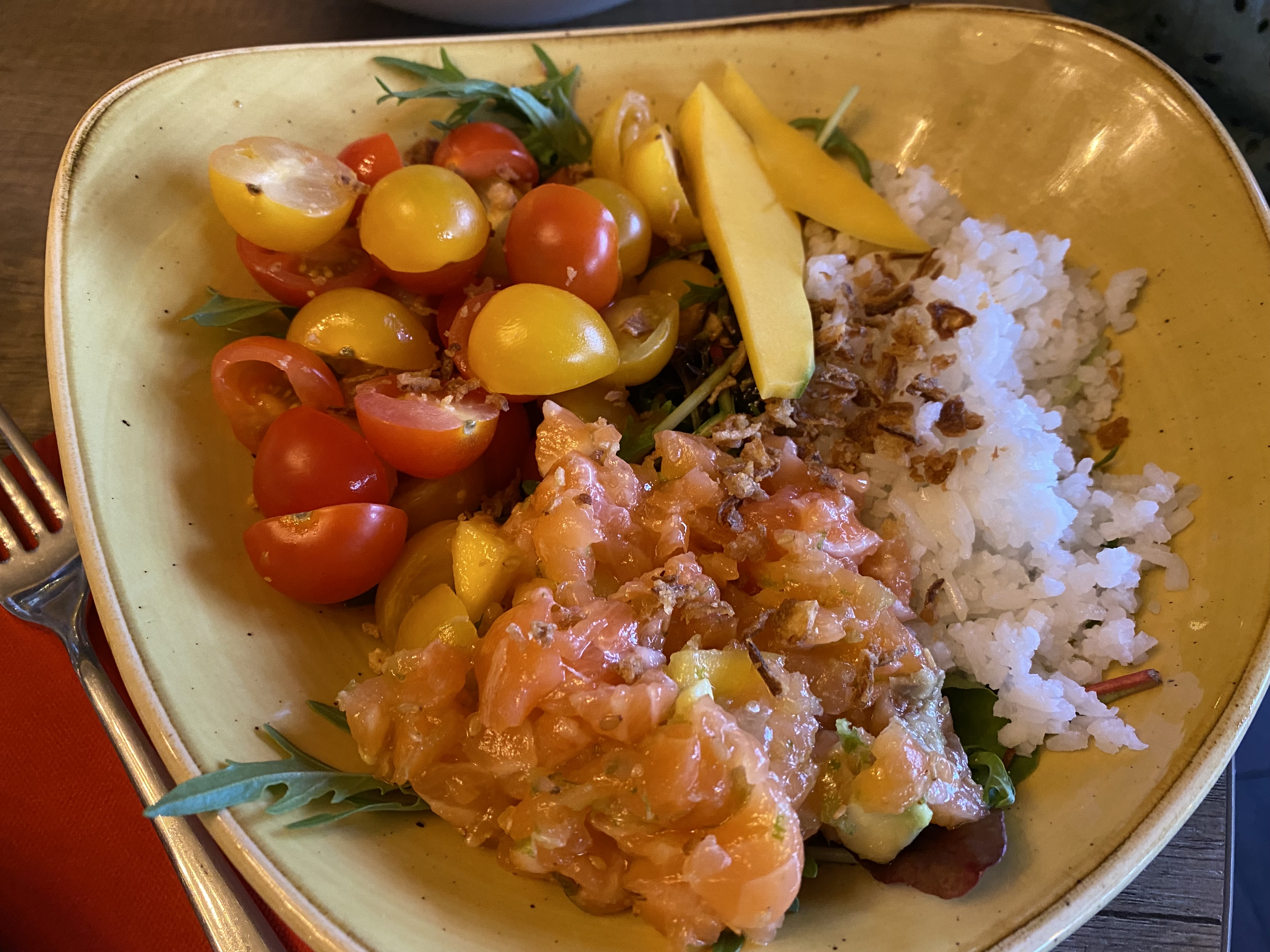 l'accueil était aimable, par contre je n'ai pas aimé du tout le POKE BOWL SAUMON, le nom fait rêver mais en fait c'est une salade froide donc de riz blanc avec du saumon cru et des légumes et on vous donne avec de la sauce nuoc man que je n'aime pas donc j'ai demandé de la vinaigrette et on m'a emmené 2 petite bouteille huile et de vinaigre, bon c'est un peu de ma faute car je n'ai pas fait attention à la composition du plat, si j'y retourne je mangerai autre chose