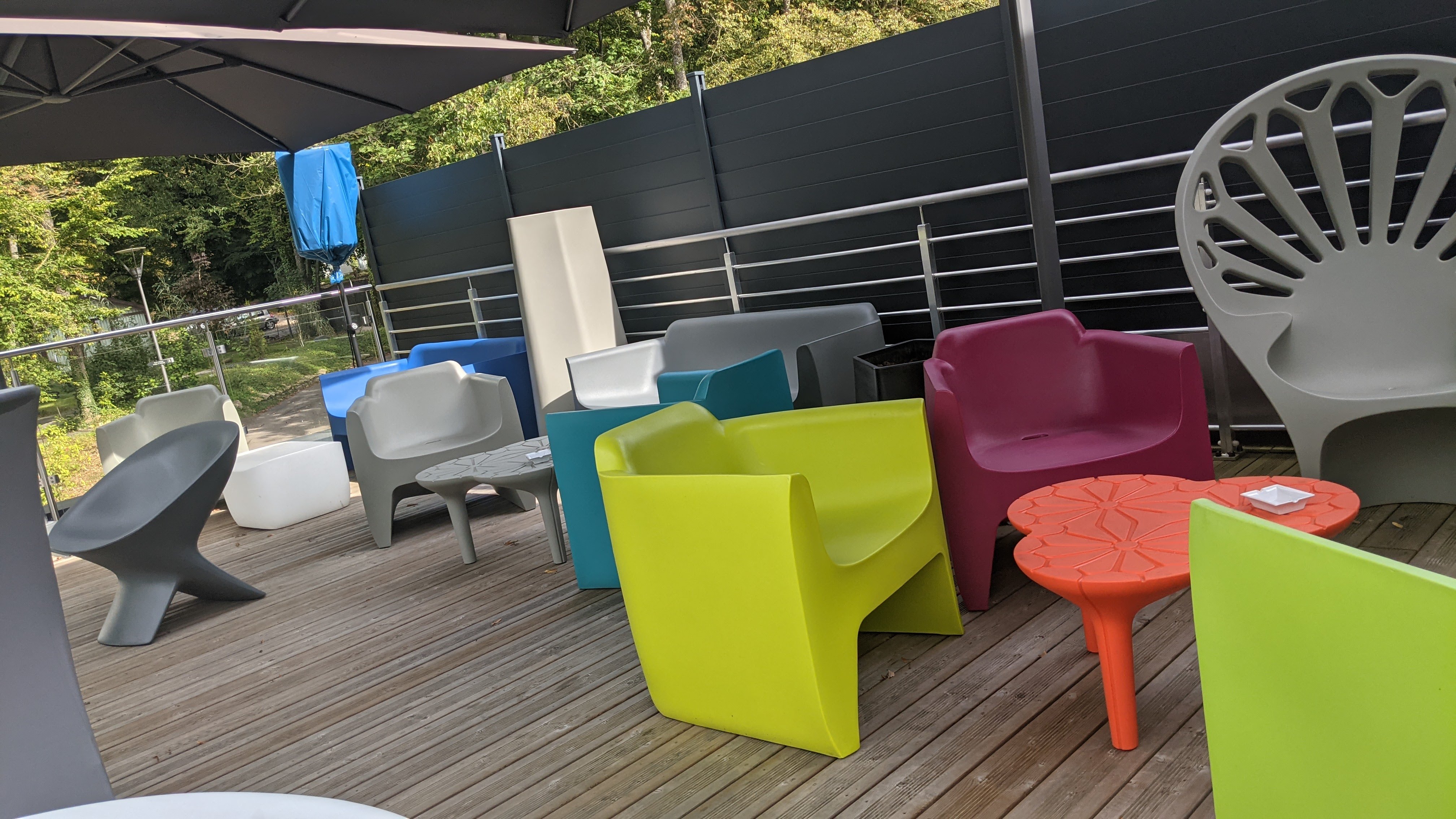 restaurant ouvert depuis peu dont on attendait beaucoup l'ouverture! cadre très réussi, classe, moderne, jolie terrasse, on se gare sous les arbres, le début commence très bien. Le personnel es habillé comme celui des avions, c'est rigolo! après ça se complique! quand il fait 37 degrés dehors, on ne met pas les gens en terrasse !!! sous prétexte qu'avec le covid , la clim ne peut fonctionner à l'intérieur et qu'il fait meilleur dehors que dedans!!!! c'est le seul restaurant parmi la dizaine que j'ai faits cet été qui n'a pas la clim!! tous les magasins ont la clim!! la salle à l'intérieur était baignée d'ombre et donc plus agréable!! nous avons dû nous battre avec les guêpes, la fumée du café chauffé pour les faire fuir!!! comment apprécier un repas dans ces conditions??? le service est très fade, jeune personnel timoré , aucun contact avec le client, c'est très long et on ne nous demande pas si ça s'est bien passé!! les plats sont corrects, pas extraordinaires, mais manquent franchement de finesse et d'originalité! on est très loin du bistronomique annoncé! c'est décevant par rapport au cadre! donc même sans la canicule, la cuisine ne donne pas envie de revenir dans de meilleures conditions à l'intérieur! j'espère qu'ils vont s'améiorer pour mettre en valeur ce beau lieu!