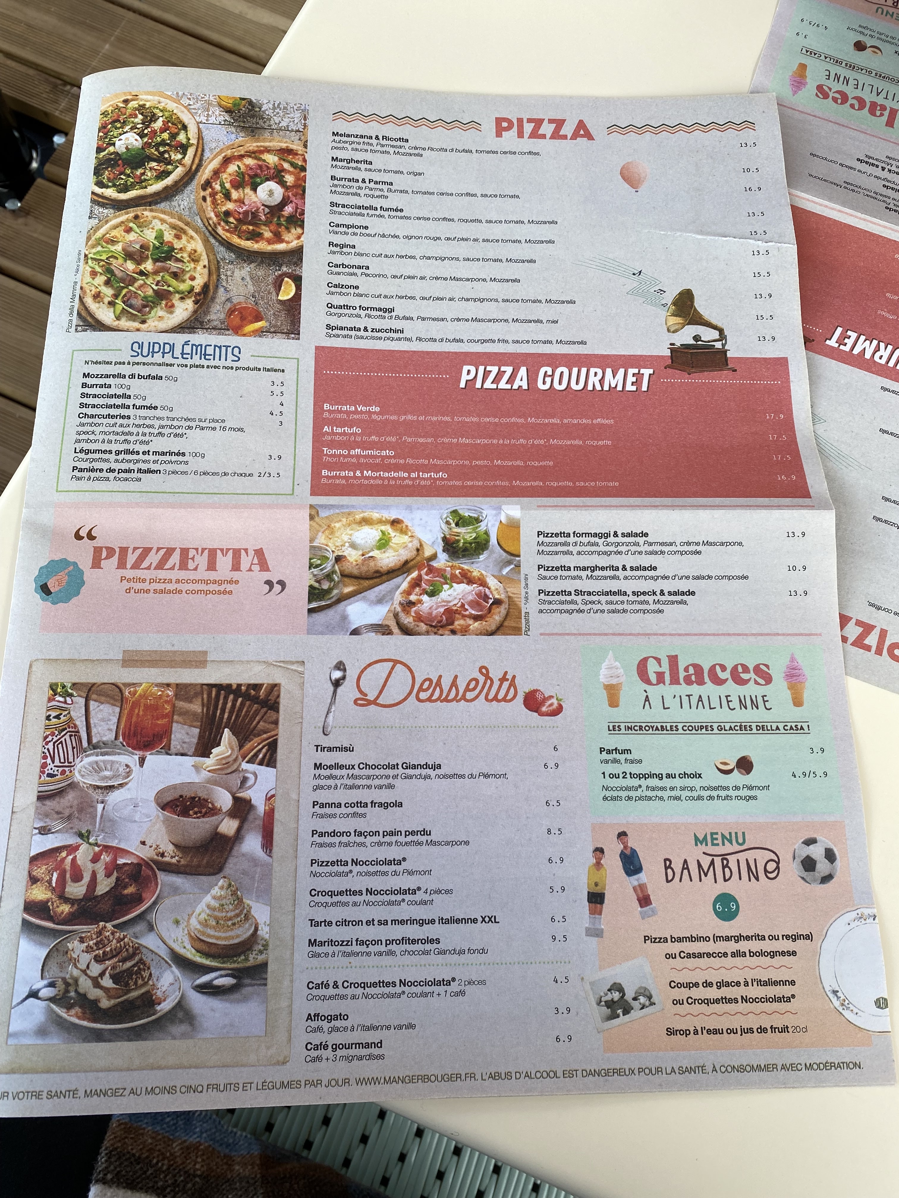 Nous sommes venus plusieurs fois dans ce restaurant lors de nos vacances. La qualité et surtout la quantité a baissé. La pizza avec peu d'ingrédients (la burrata coupée en 4) pour un prix de 17.90 €... Ça ne les vaut pas. La bière était aussi cher. Le menu enfant comportait y'a quelques mois 4 croquettes de nocciolata: Maintenant, il y en a 2... Je ne recommande plus ce restaurant.