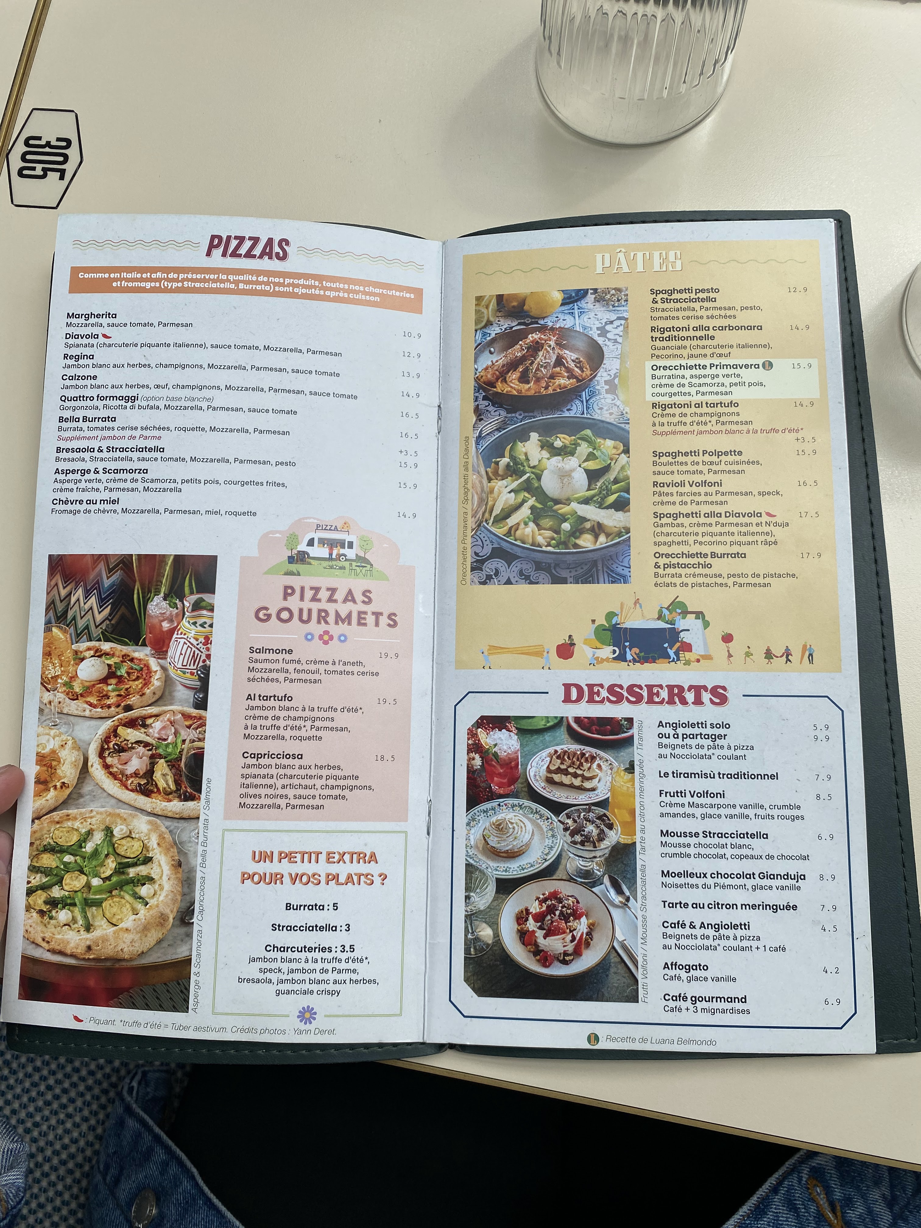 Tres bonnes Pâtes carbonara à l'italienne (à l'œuf et guanciale) et les pizzas burrata ou straciatella également. Service assez long (un vendredi midi). Belle déco intérieure. Prix raisonnables. Je recommande 😋