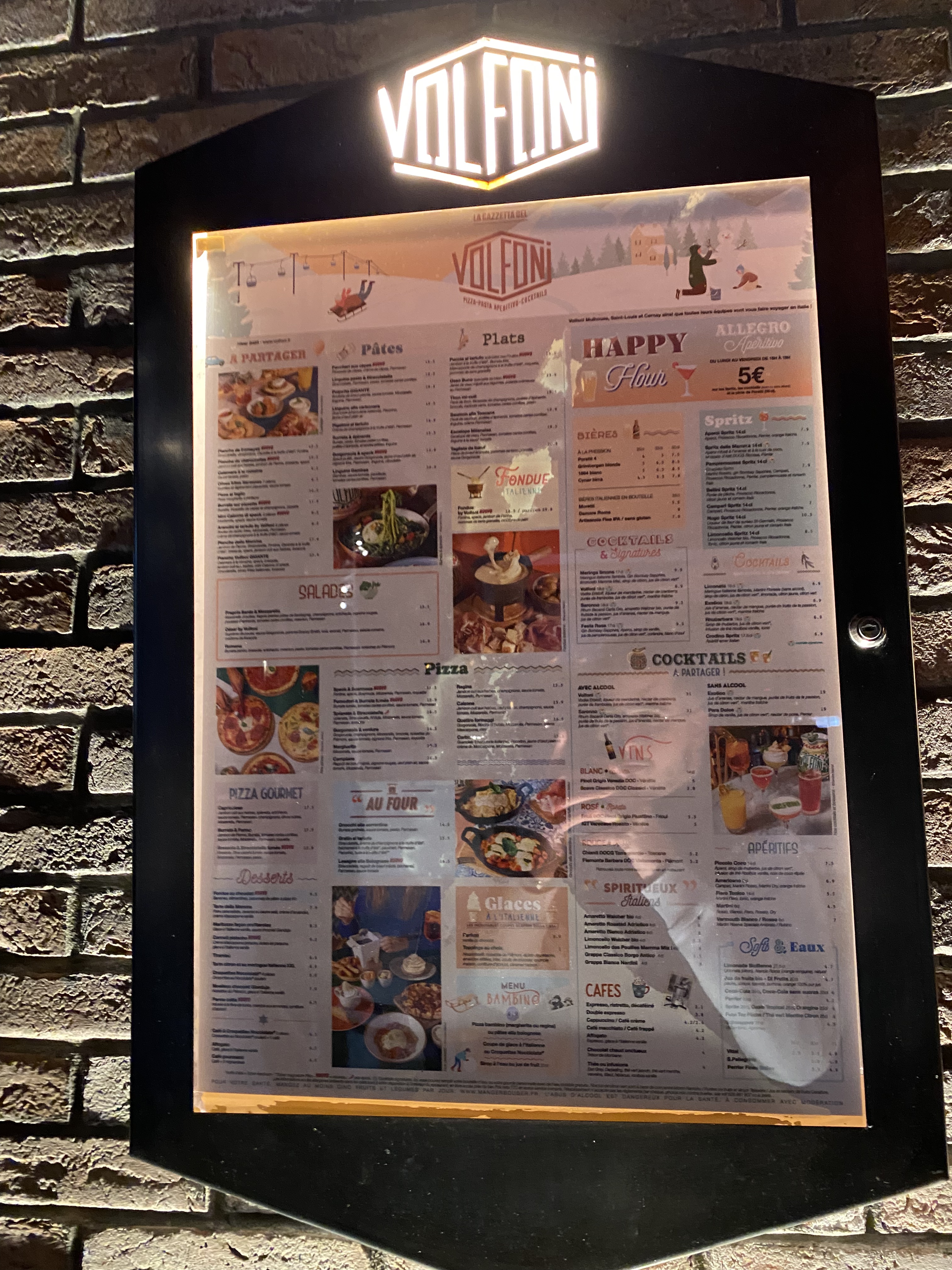 Le cadre est excellent, les décorations sont sympathiques ce qui est l’identité de marque de Volfoni ! C’est réussi, à l’instar de Starbucks. Cependant, j’ai noté 3/5 pour 2 points : - l’accueil client est pas très professionnel, le patron du restaurant ne fait pas vraiment dans la sympathie mais plutôt dans l’efficacité. - les plats sont cher pour ce qu’ils sont, c’est bon sans être incroyable non plus, mais le rapport qualité prix n’est pas terrible. Malgré un repas à 16€, je n’avais vraiment pas mangé à ma faim ! Mais vraiment, le cadre est excellent ! C’est à faire une fois mais pas forcément à refaire