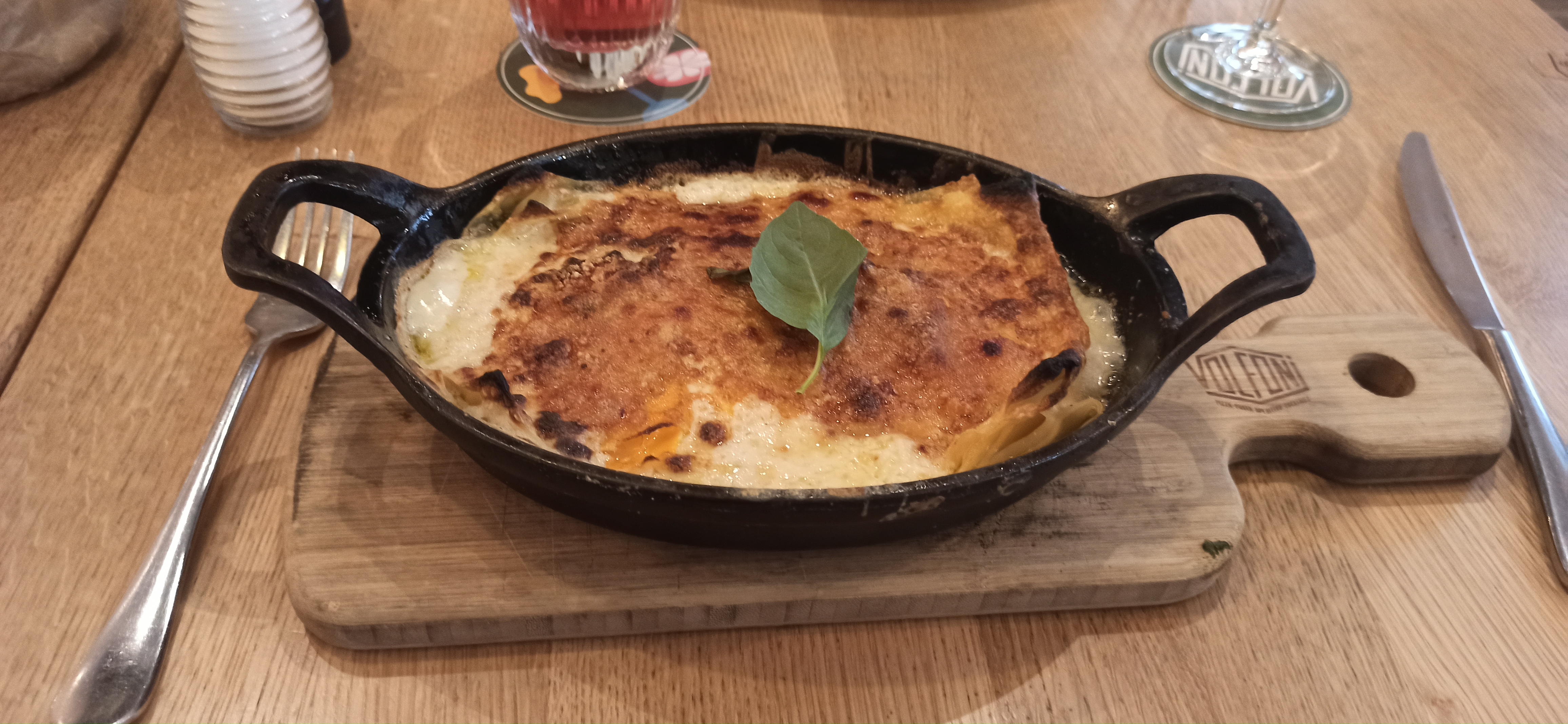 Nous sommes venus dîner chez Volfoni sans trop l'avoir prévu en rentrant d'une promenade, sans avoir réservé, ce qui n'a pas du tout été un problème. Dès l'extérieur le restaurant frappe par la beauté de sa décoration, surtout dans la salle principale dans laquelle nous ne prendrons malheureusement pas place. La salle arrière est également jolie, même si de près, on remarque le côté plastique des plantes. La vaisselle est plutôt jolie, notamment les verres un peu rétro. La carte format journal, imprimée, indique que nous sommes dans une chaîne, ce qui n'est pas forcément un problème, d'autant que le restaurant joue la carte plus moderne de la traçabilité (avec la possibilité de connaître l'origine des ingrédients via QR code). Niveau plat, on va de la carbonara (au Guanciale s'il vous plaît) à la picata. Du très classique réconfortant, comme on l'attend d'un restaurant italien. Sans grande surprise mais efficace. J'opte donc pour la polpetta géante et une pinte de bière italienne, qui est en happy hour (ce qui est sympa pour un resto). La carte des cocktails a l'air plutôt fournie et sympathique. La viande et la sauce tomate sont très bonnes, quoiqu'un peu trop sucrée à mon goût pour cette dernière, que l'on retrouve en trop grande quantité dans l'assiette. La présentation est plutôt jolie et appétissante dans de petits caquelons. Les pizzas ont l'air bonne, mais l'enseigne ne surfe pas sur la vague des pâtes napolitaines aériennes. Rien à redire, si ce n'est que le côté usine et très rapide nous rappelle que nous sommes dans une chaîne qui se doit de tenir un cahier des charges. Le service était néanmoins souriant et agréable. Pour gagner en rapidité il est possible via un bip à table d'appeler un serveur ou une serveuse dans un but précis (commande, addition). Sans doute indispensable dans un lieu aussi grand, mais qui m'a un peu donné l'impression d'exploiter le personnel. Ce repas a en résumé été agréable, très vite servi et mangé, idéal quand on n'a pas le temps... dans un contexte de flânerie , c'est peut être un chouïa expéditif.