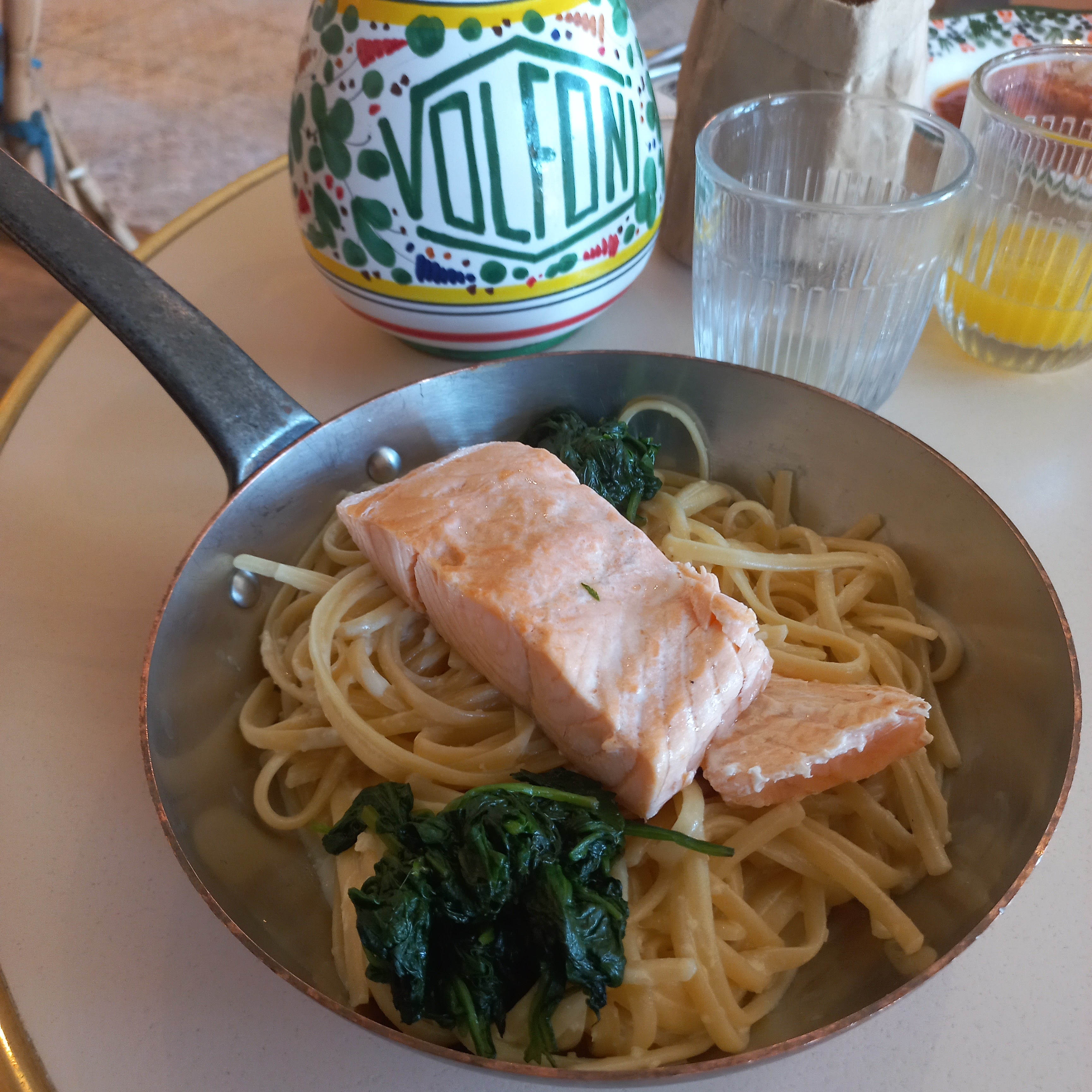 La décoration est vraiment très jolie, par contre c'est très bruyant, quand il y a beaucoup de monde comme ce dimanche midi. Le repas était décevant, les portions de pâtes sont petites, la qualité très moyenne mais le prix est élève. Quasiment 20€ pour une pizza... C'est bien cher, malgré qu'elle soit plutôt bonne.