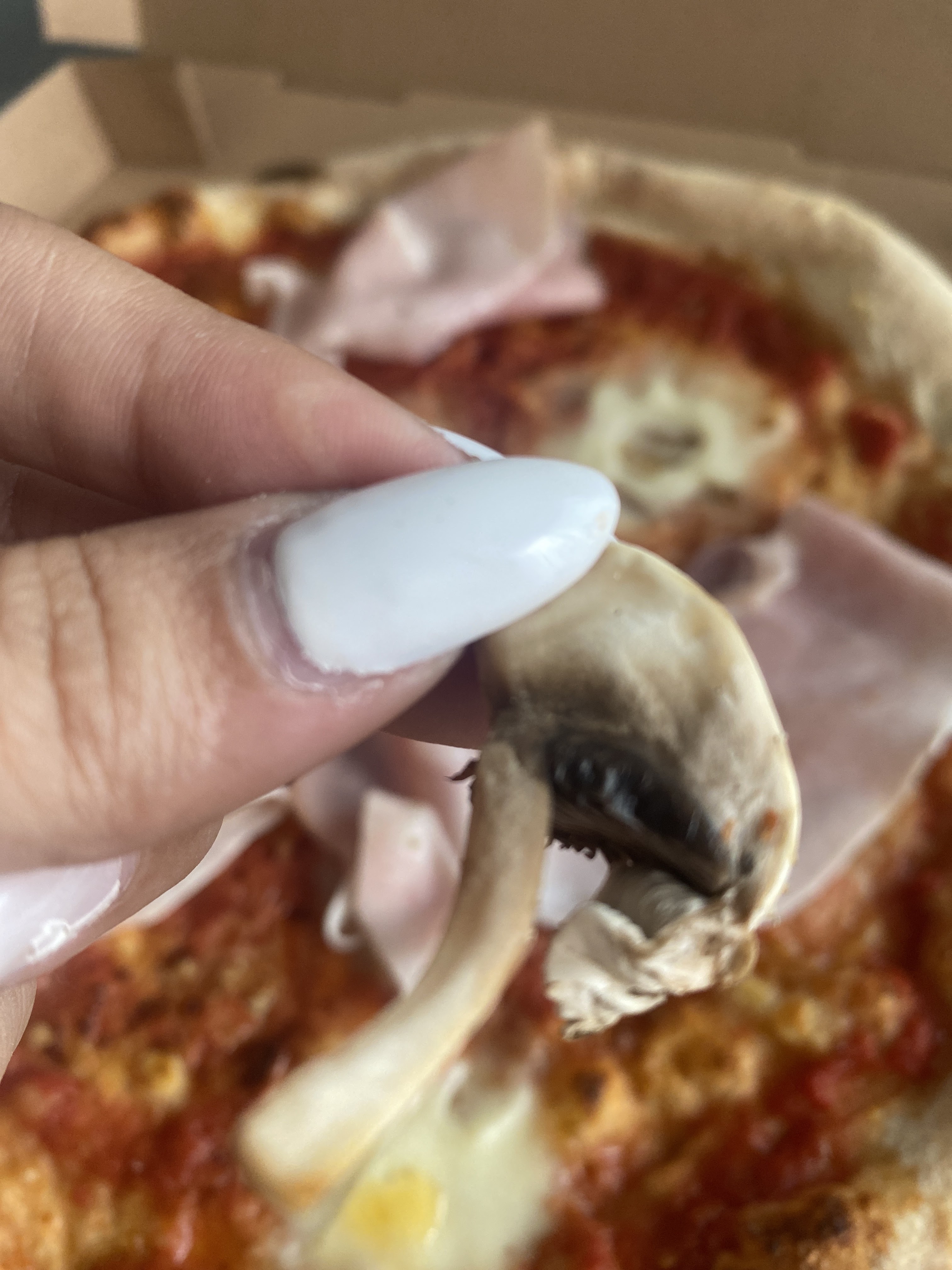Pizza sans aucun goût, champignons pas cuits (littéralement!) apparemment c’est une recette… Jambon bien vert… qui n’inspire absolument pas confiance… bref, fuyez !