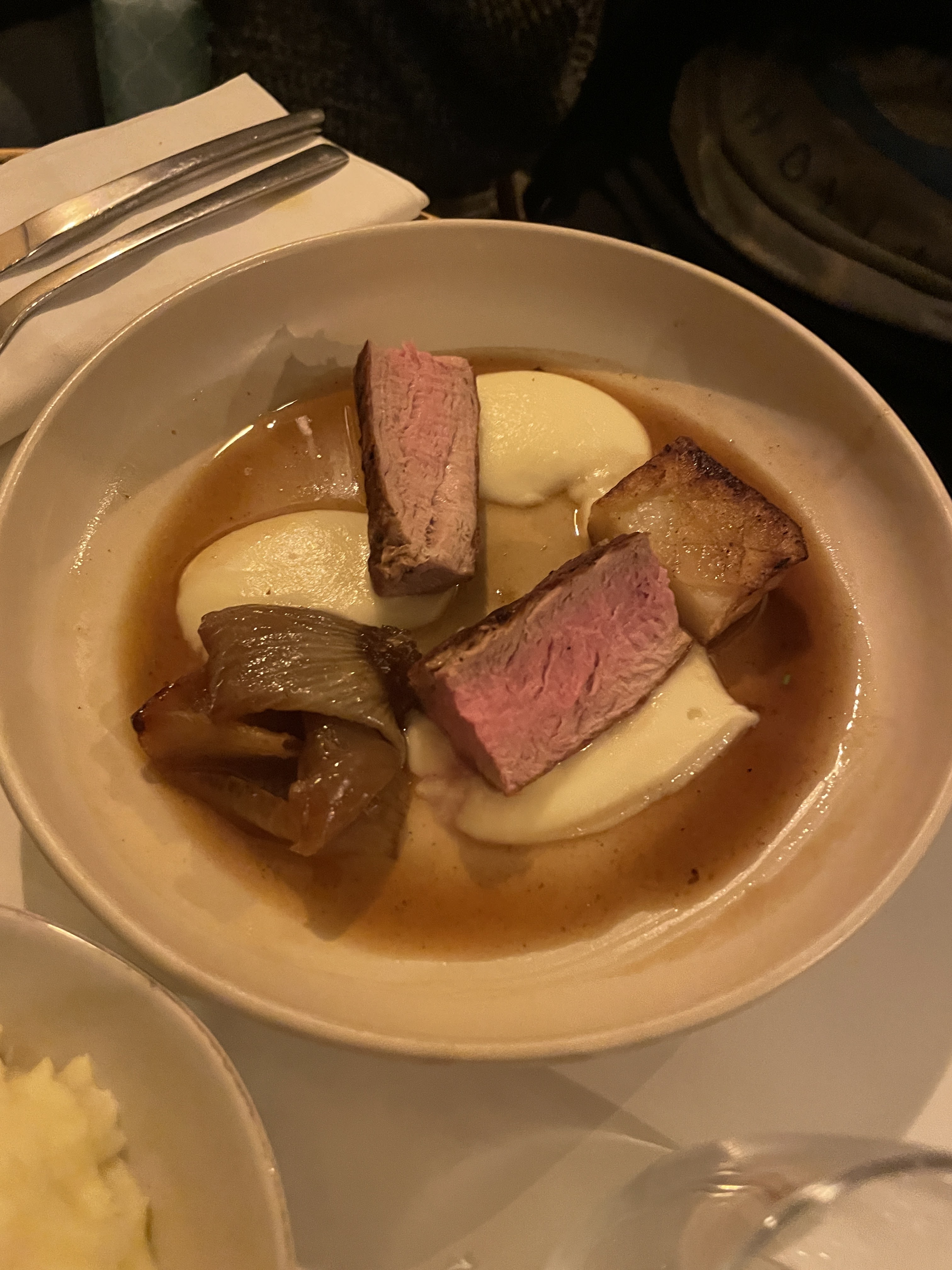 Très bonne soirée passé dans ce restaurant à l'ambiance cosy et moderne. Nous sommes venus avec un petit chien (du genre à dormir sous la table) et il fut accueilli avec une gamelle d'eau ! Les plats étaient vraiment succulents. J'ai mangé des ris de veau pour la première fois et ce fut un régal avec l'espuma au comté. La brioche perdue était délicieuse. Les conseils en vins, apres avoir donné nos préferences, se sont avérés très bons ! Je recommande :)