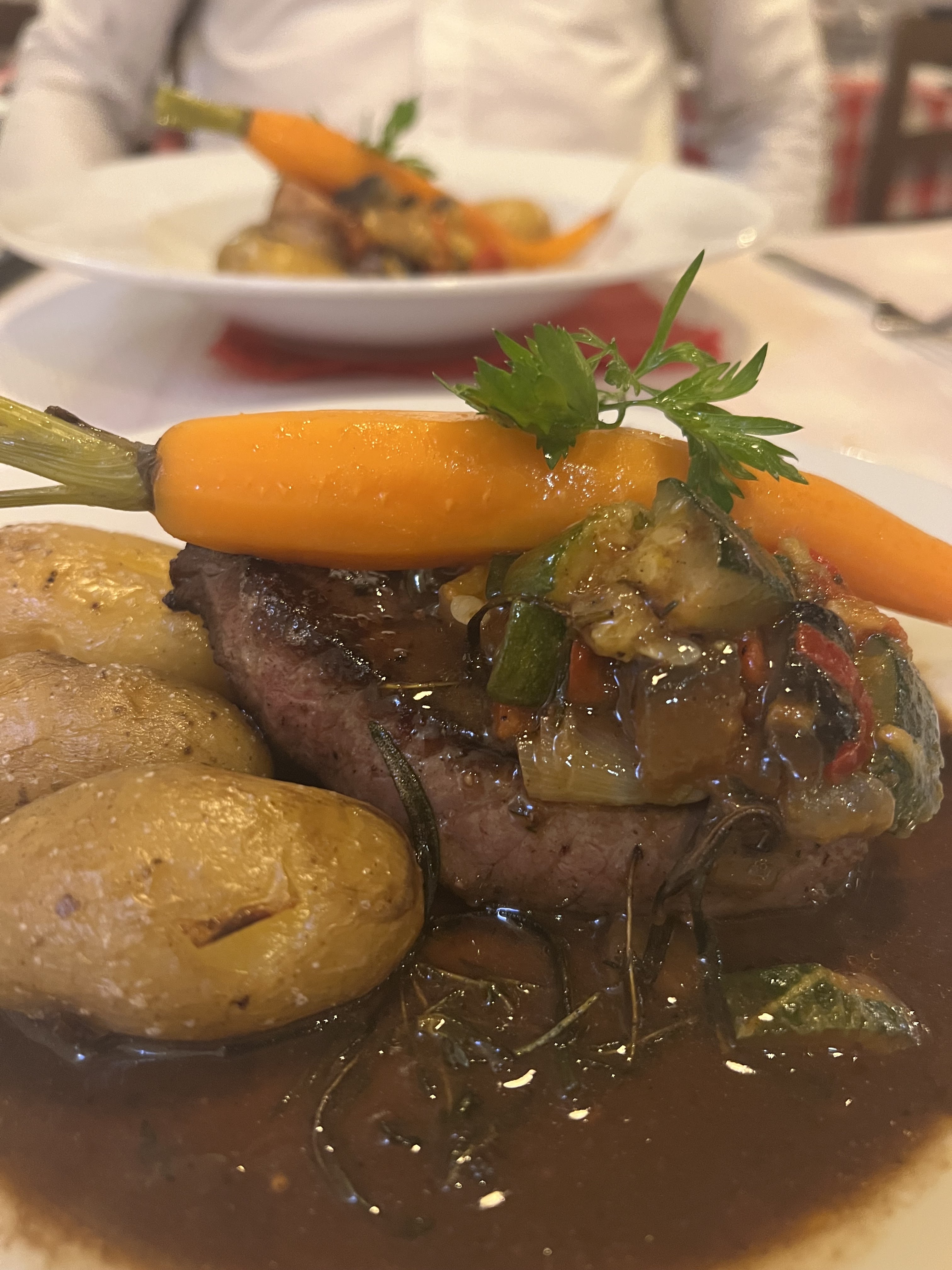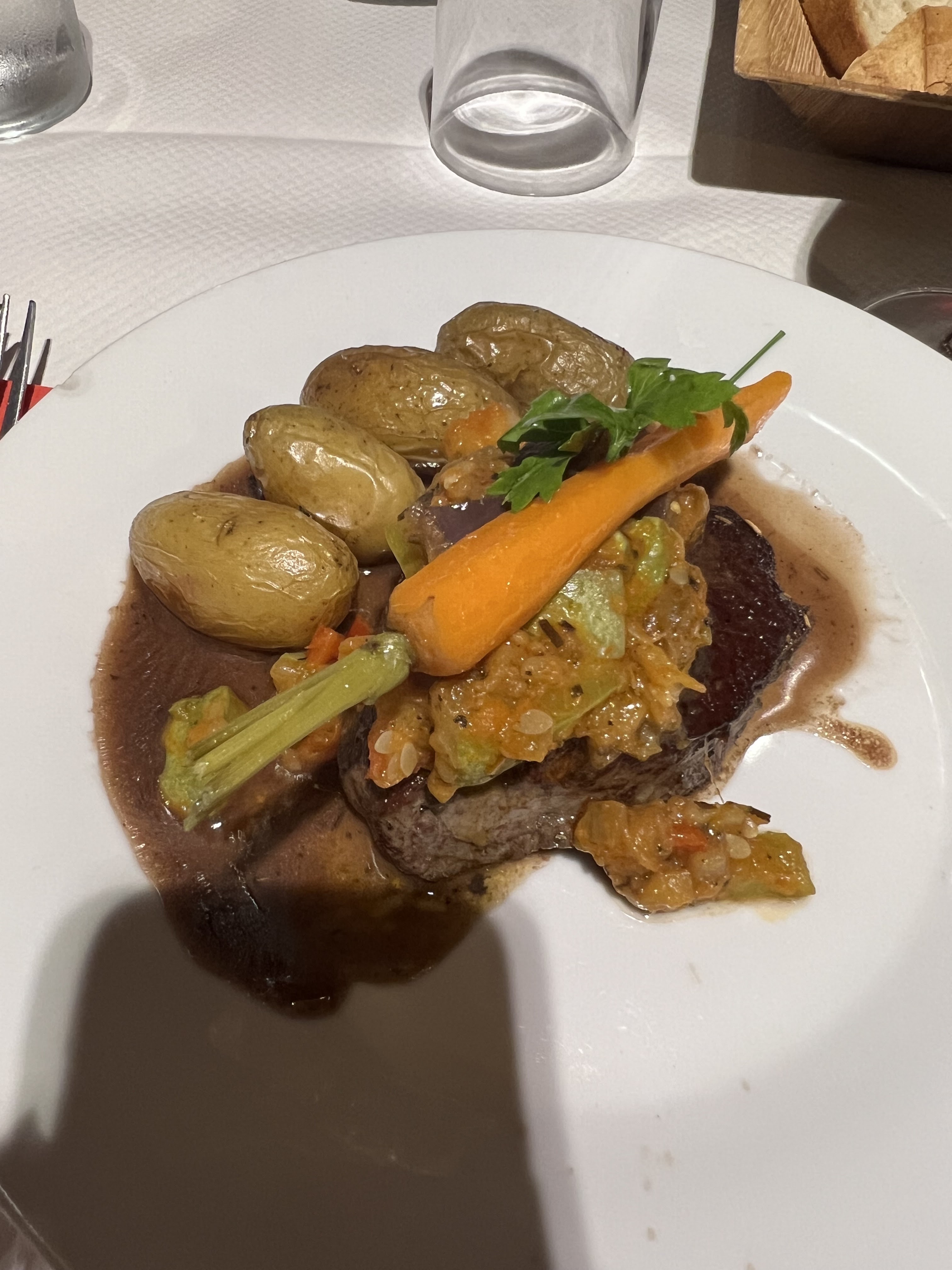 Vraiment super, on a super bien mangé ! Cuisson de la pièce du boucher parfaite, la sauce était sublime et la carotte parfaite ! Ne changez pas ! Sinon le poisson était juste parfait aussi ! Bravo !!