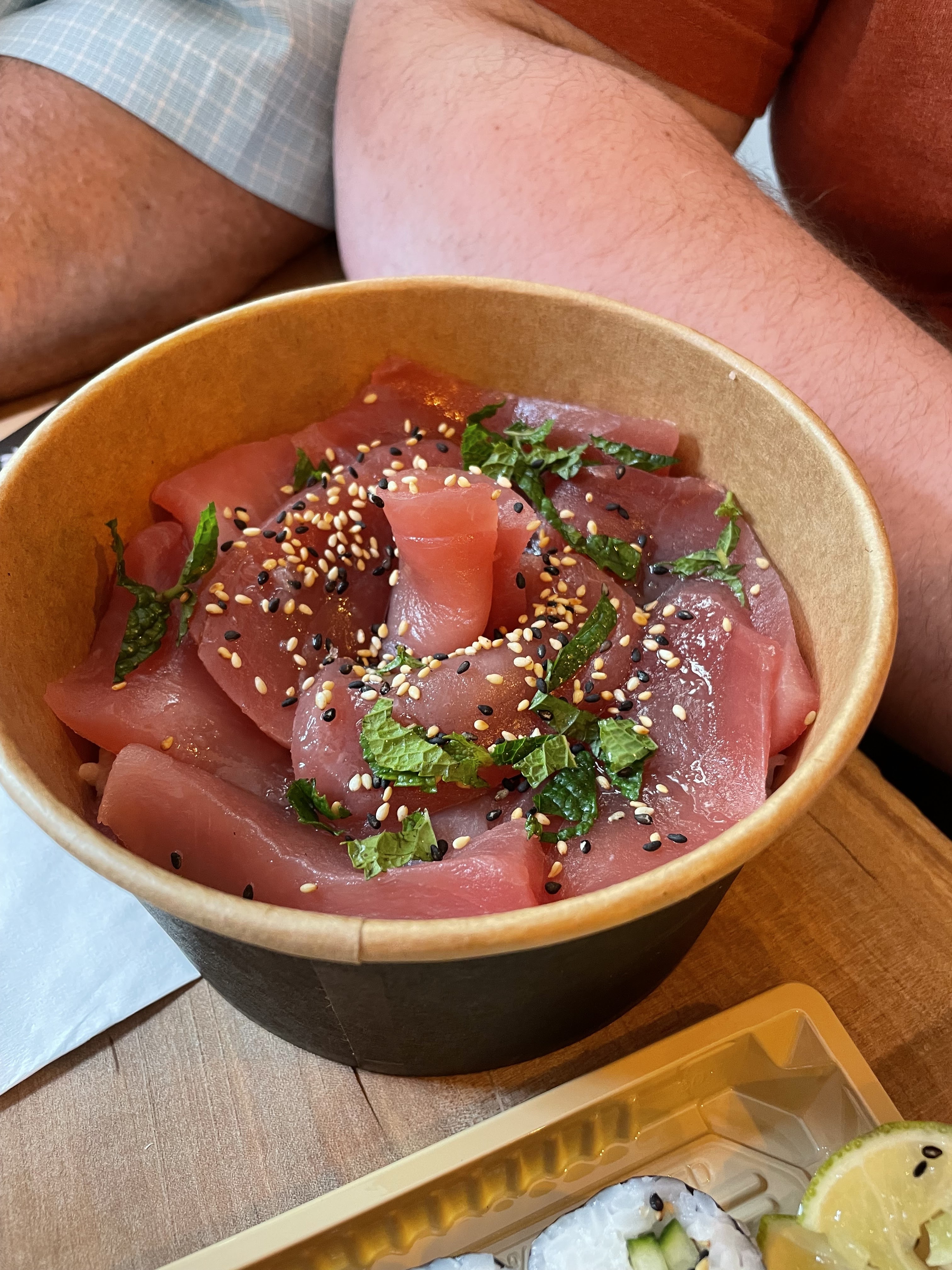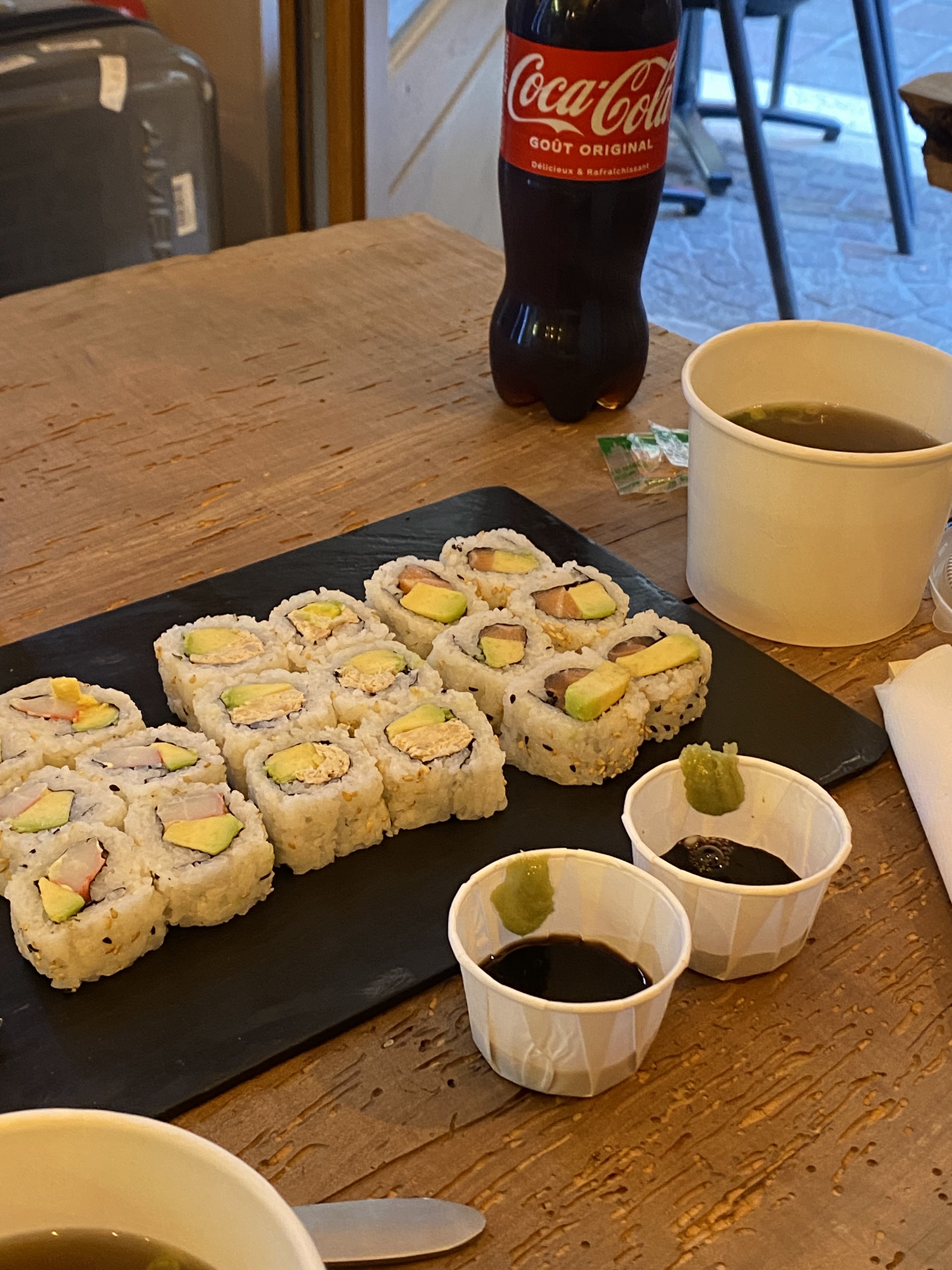 Le magasin est très petit. C'était quand même agréable d'être accueilli gentiment le matin par ceux d'entre nous qui portaient des valises :) Personnellement, le rouleau tempura aux crevettes était meilleur que le rouleau californien, et le poke au saumon était également délicieux car le riz était assaisonné comme des sushis ! C'était sympa de manger en pique-nique près du lac haha