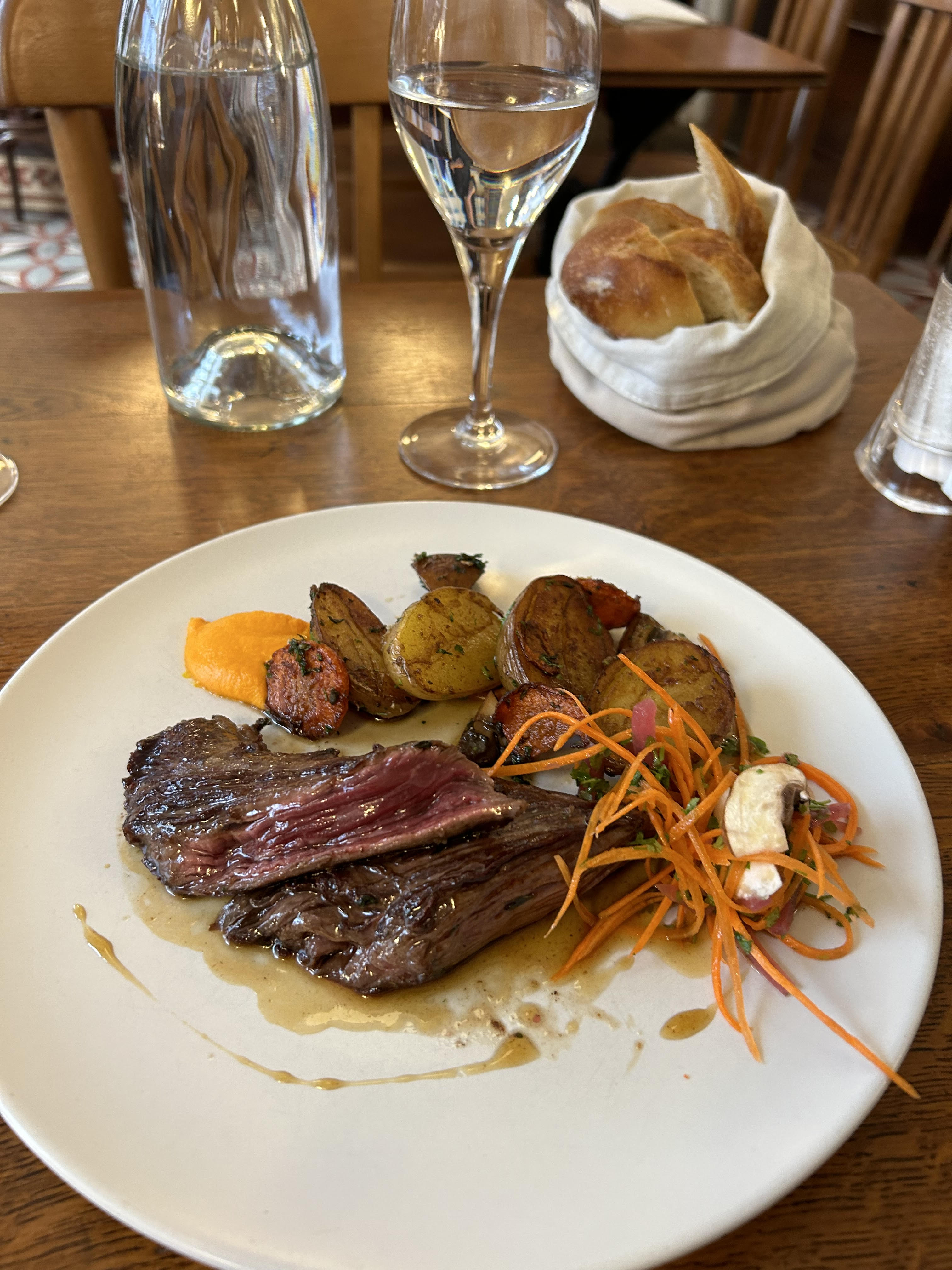 Wadja à Paris a servi un repas incroyable. J'ai commandé le steak suspendu avec des pommes de terre rôties, une incroyable purée de carottes et des légumes marinés. Le personnel et le vin étaient également merveilleux. Je recommande fortement à tout le monde.