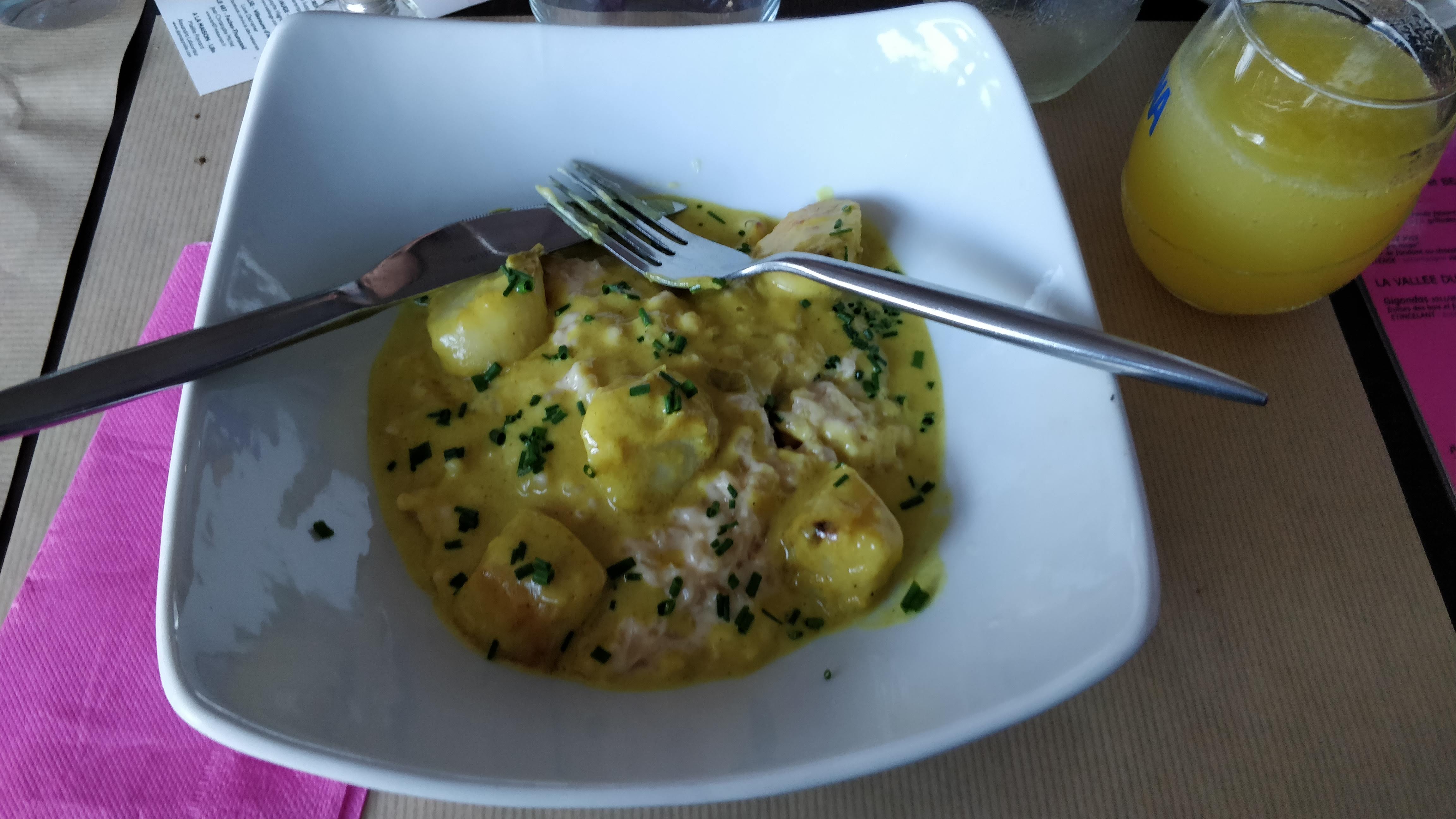 Ce midi, un cabillaud en écaille de chorizo : cuisson parfaite accompagné de tagliatelles et sauce saint Jacques ! délicieux !!