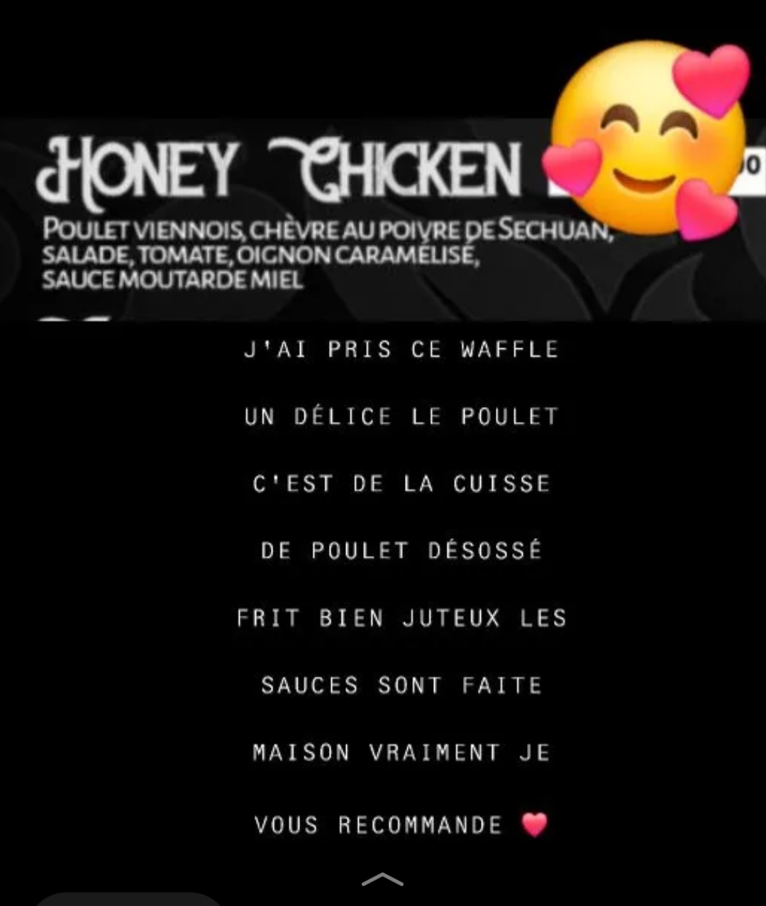 Bonjour Franchement superbe expérience a waffle city, concept très innovant et qui change par rapport au fast food sandwicherie ou de burger . Le fait maison est très présent dans la waffle , les viandes ainsi que les sauces . Les pommes de terres sont excellente avec une technique de cuisson. Leur poulet très très goûteux et très bon Sincèrement je recommande a tous de tester ce restaurant très originale.