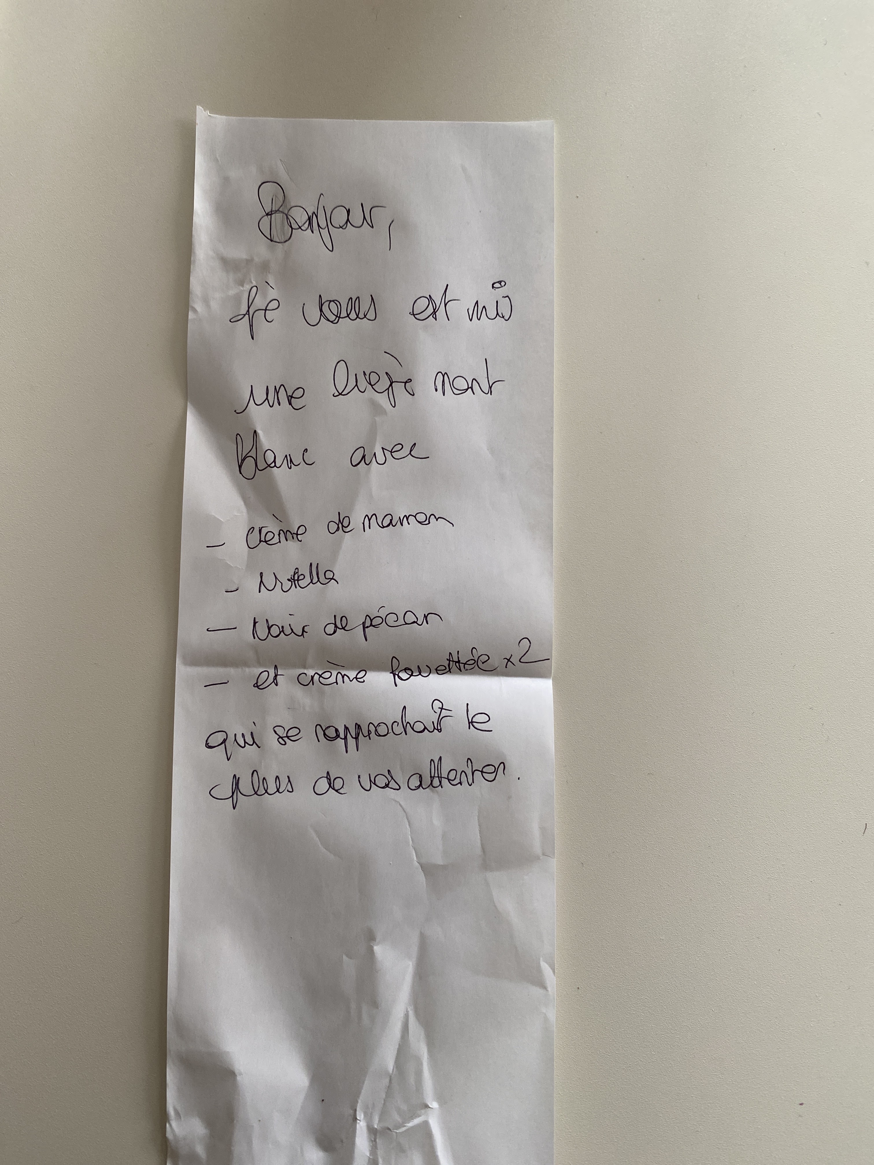 J’ai commandé 3 nappages , on m’en a servi deux . La bouteille de coca n’était pas fraîche . Cheveux dans la gaufre