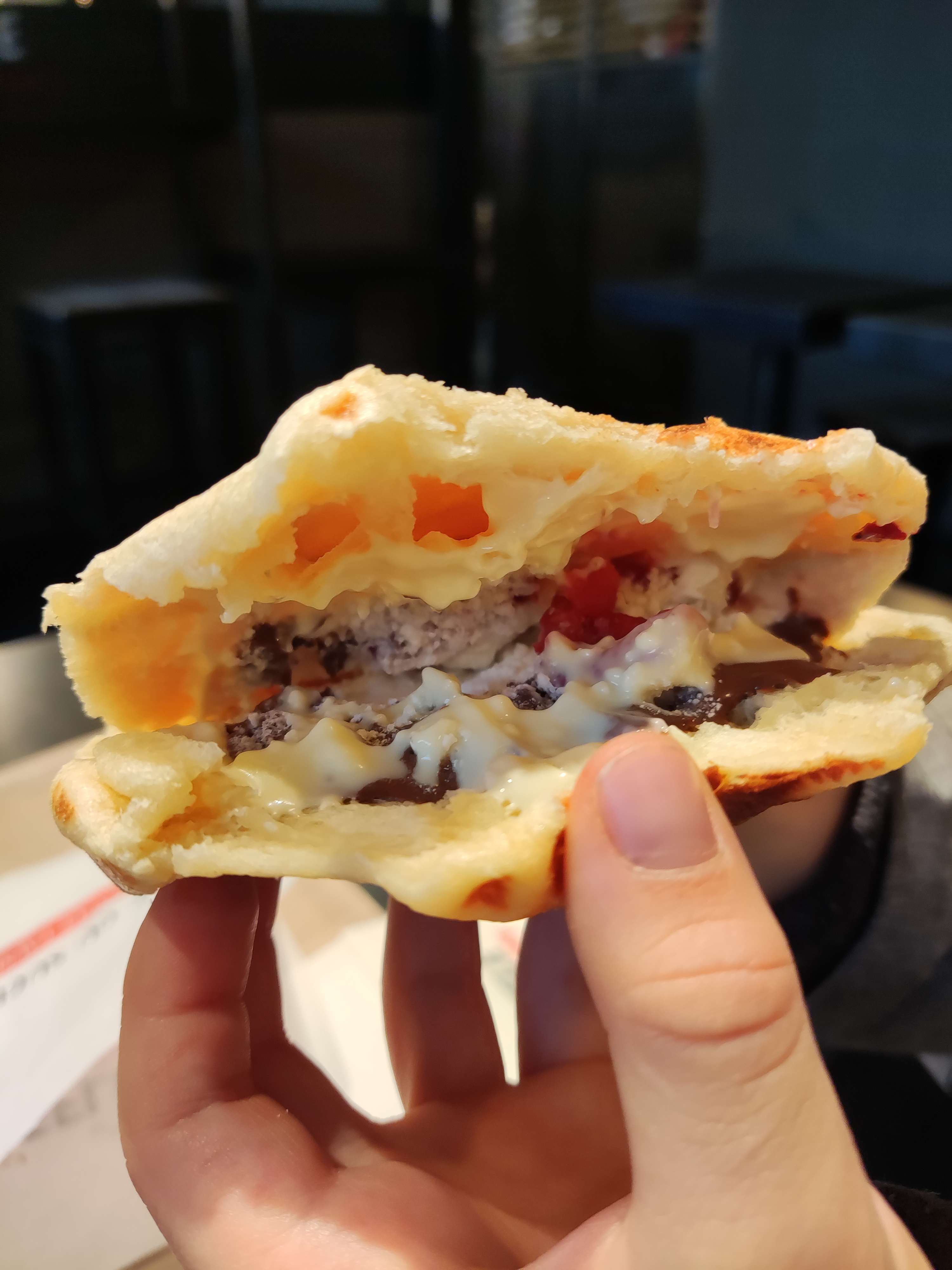 Waffle très sec et rempli de sucre. j'ai payé 4.9 pour avoir deux chocolats mais le waffle reste sec. Je ne referais jamais celui là.
