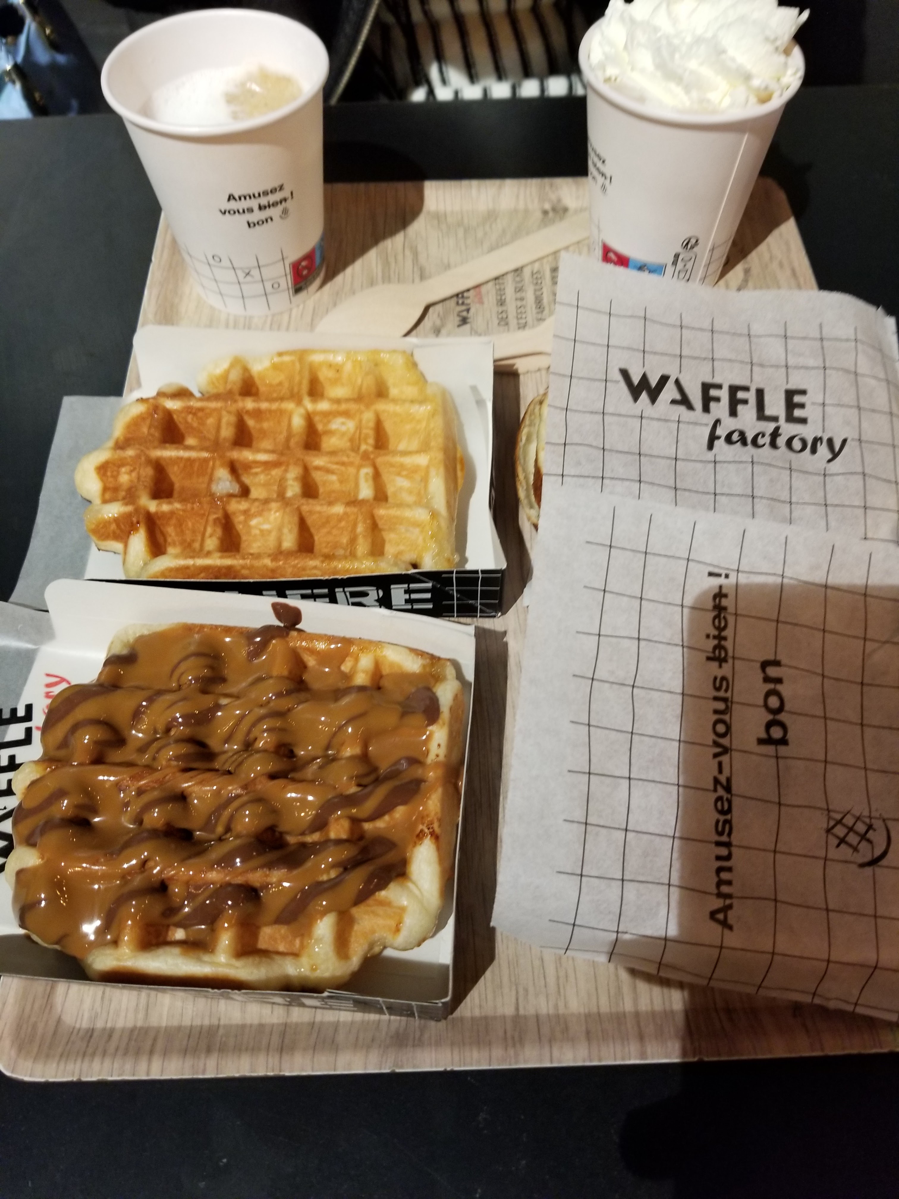 Premiere fois que j'allais dans un Waffle Factory, et j'ai bien aimé. J'ai pris la simplicité: gaufre au nutella. Le smoothie caramel beurre salé était bon aussi. Pas mal d'attente mais il y avais beaucoup de monde, qui dit beaucoup de monde dit que c'est bon 😁 On entre notre prénom sur les bornes et on nous appelle pour aller chercher la commande. En tout cas j'y retournerai si j'en ai l'occasion 😊🧇