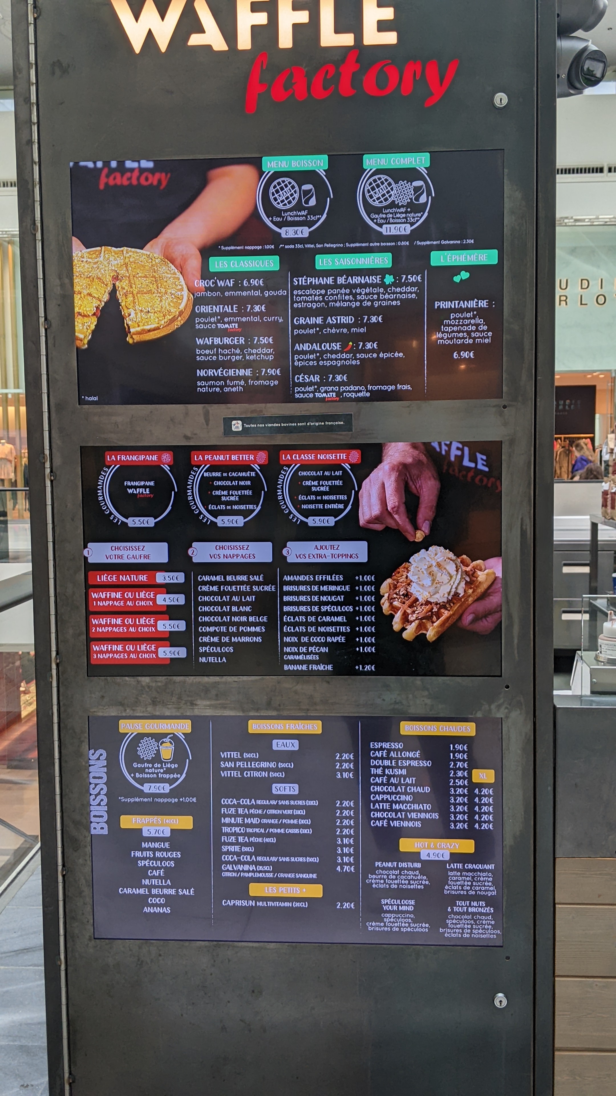 Franchement très déçu des méthodes de ce point de vente, on ne nous laisse pas consulter la carte pour nous inviter à acheter un menu sans prix affiché comprenant une gaufre nature + une canette, le nutella et/ou la chantilly sont en supplément. Les photos de la liège montrent la Liège avec nutella+chantilly. Si je comprends bien dans ces conditions on paye un menu vide à 10€, la gaufre et la canette le nutella, la chantilly sont chacun un supplément donc? De plus, l'accueil laisse à désirer, avec un vendeur en caisse qui mâche du chewing-gum en faisant de la vente forcée. Dommage, en tout cas moi je ne recommande pas!