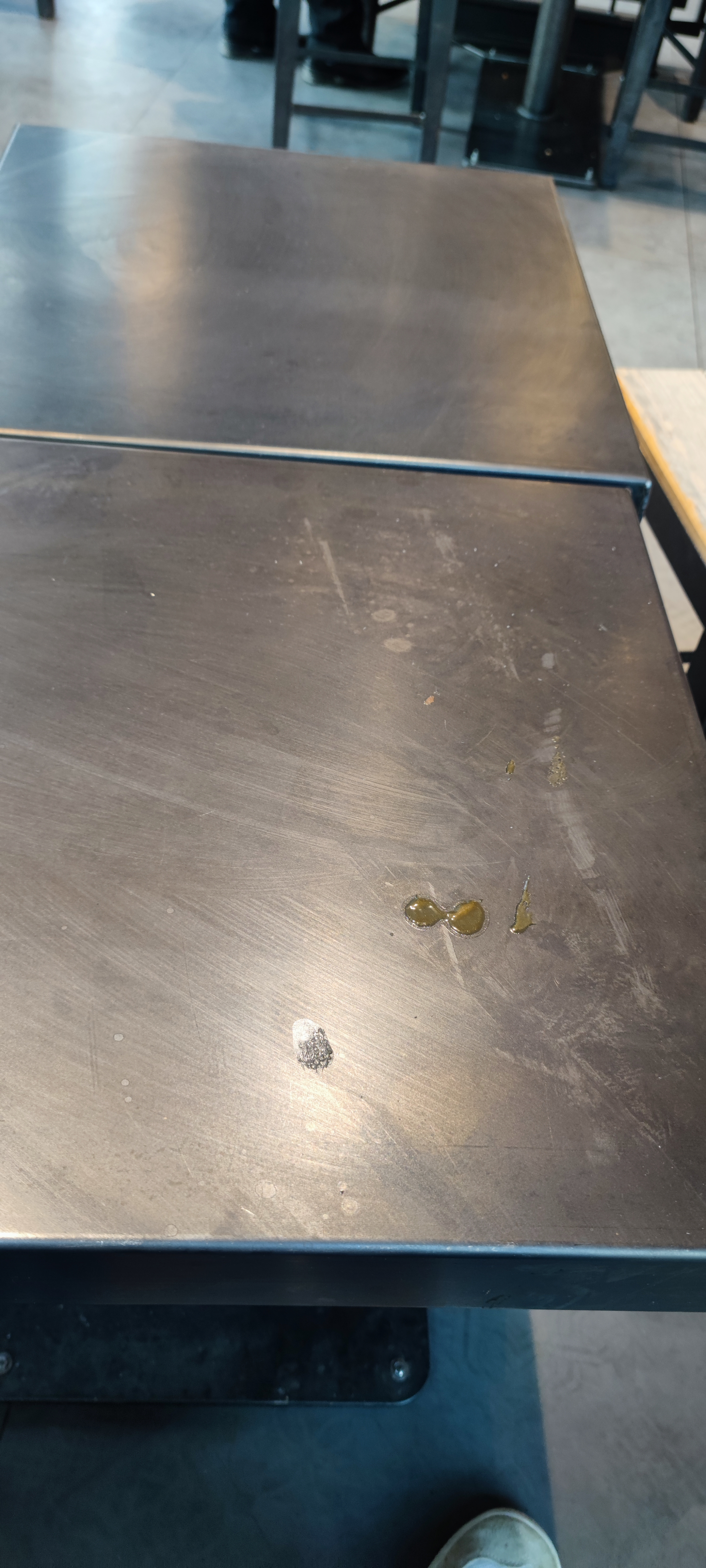 Tables métalliques noires non adaptées et sales, elles ne doivent pas voir un coup d éponge de la journée. J espère que la cuisine est plus propre..pas de débit, service long.. le take away est sur le même comptoir que ceux qui consomment sur place.. salle petite et bruyante..personnel qui a l'air blasé..perso celui des 2 lions est plus agréable car pas de salle juste une terrasse et de la vente a emporter