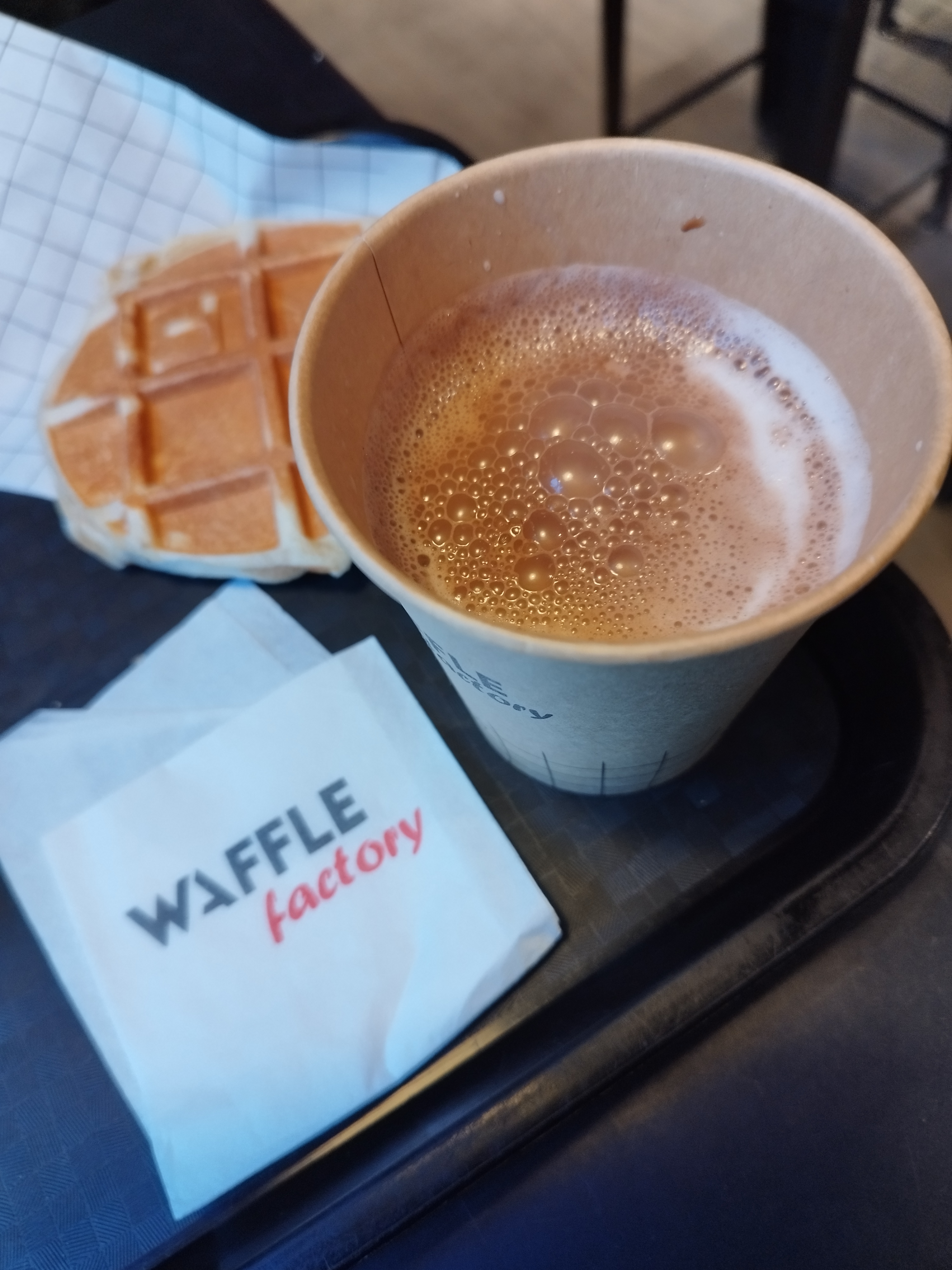J'ai commandé une gaufre avec du chocolat belge et du cappuccino. J'ai reçu du café presque bouillant avec du lait surchauffé et une gaufre bon marché avec une grande quantité de sucre. Je pouvais sentir les cristaux de sucre à l'intérieur de la gaufre. Je ne recommanderais pas