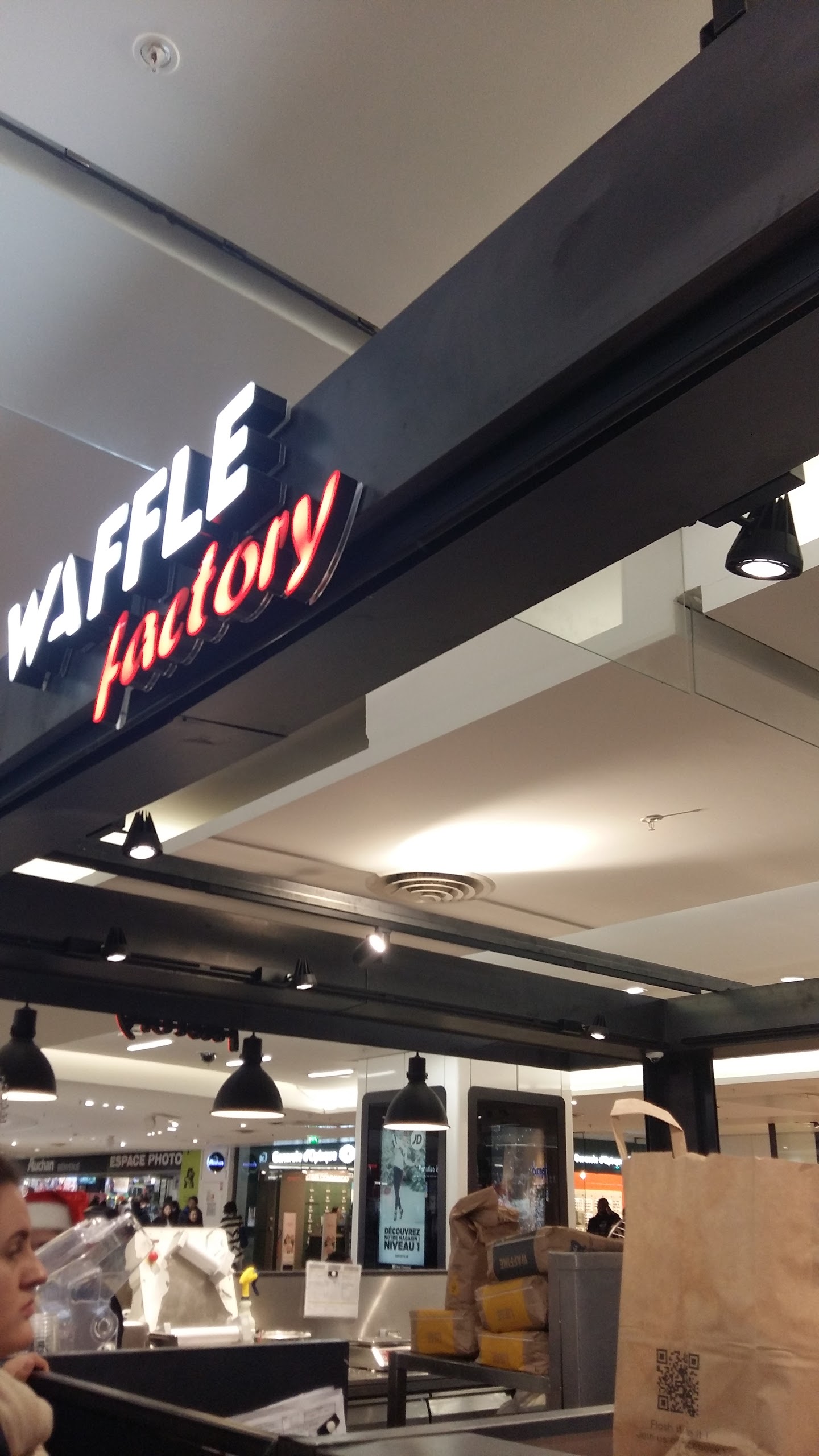 J'ai beaucoup apprécié l'accueil chaleureux du responsable du Waffle Factory, je ne savais pas que j'avais la possibilité de commander via l'écran, et il l'a vite remarqué et me l'a expliqué, J'ai beaucoup aimé leur service rapide et pourtant il avait beaucoup de monde, vrai camp de fourmis pour que le service soit rapide, norvégienne et gaufre délicieux, la seule chose que je n'ai pas appréciée, c'est l'égoïsme des gens , une a fini de manger mais elle a quand même pris place. Une autre petite-fille a confisqué une table sans que elle et les membres de sa famille soient assis dessus