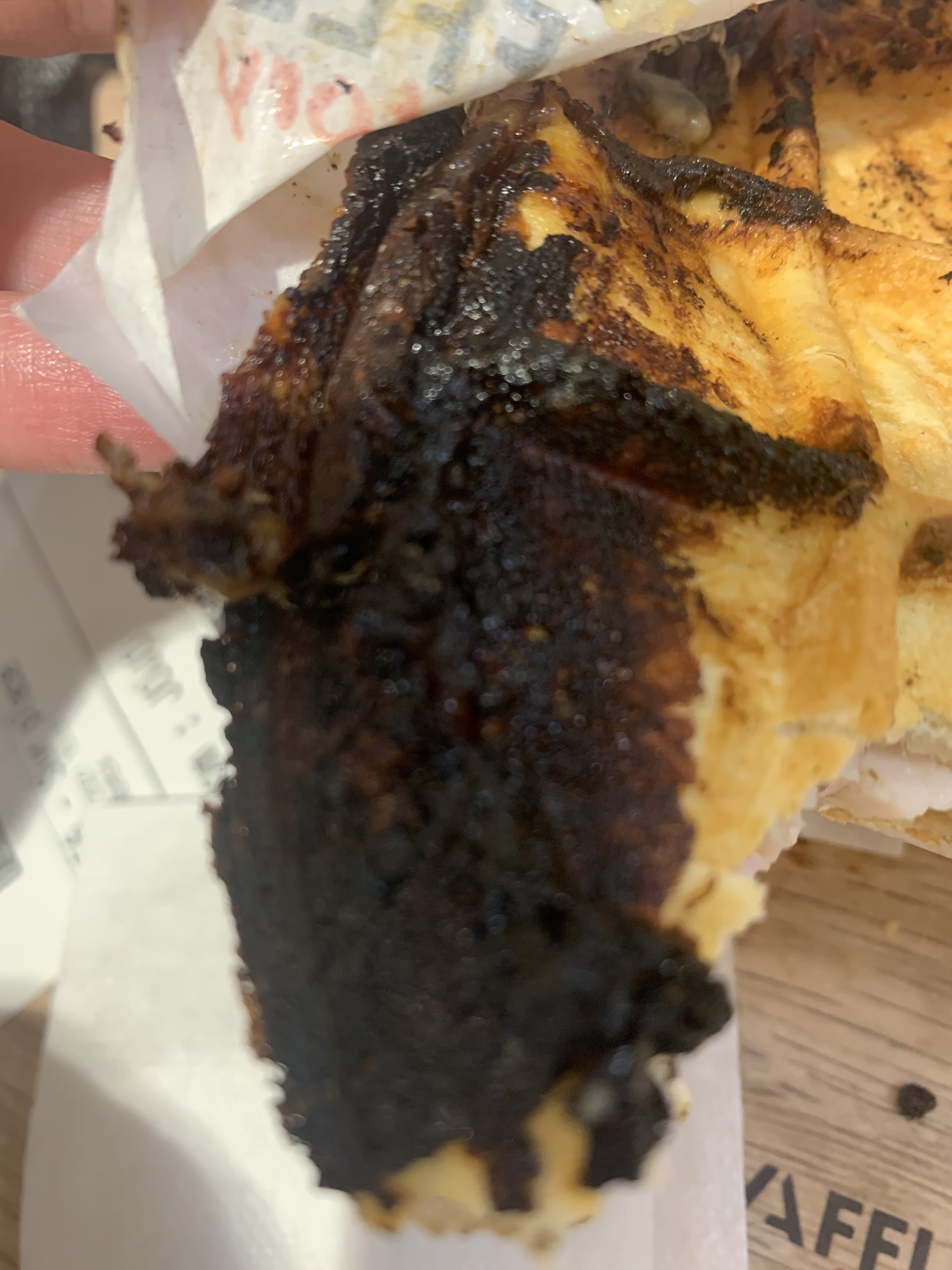 Cela fait des années que j'achète des gauffres chez vous, mais la qualité se dégrade vertigineusement depuis quelques mois. Très souvent, les gauffres sont à peine cuites, elles sont blanches. Aujourd'hui, j'ai une gauffre mal cuite et une gauffre cuite dans un gauffrier mal lavé! Vous pouvez constater tous les résidus noirs... top pour la santé, surtout pour des enfants! J'espère que le gerant de cette boutique prendra le temps de mieux former ses équipes. Ou doit-on remonter ce souci à la direction de Westfield?
