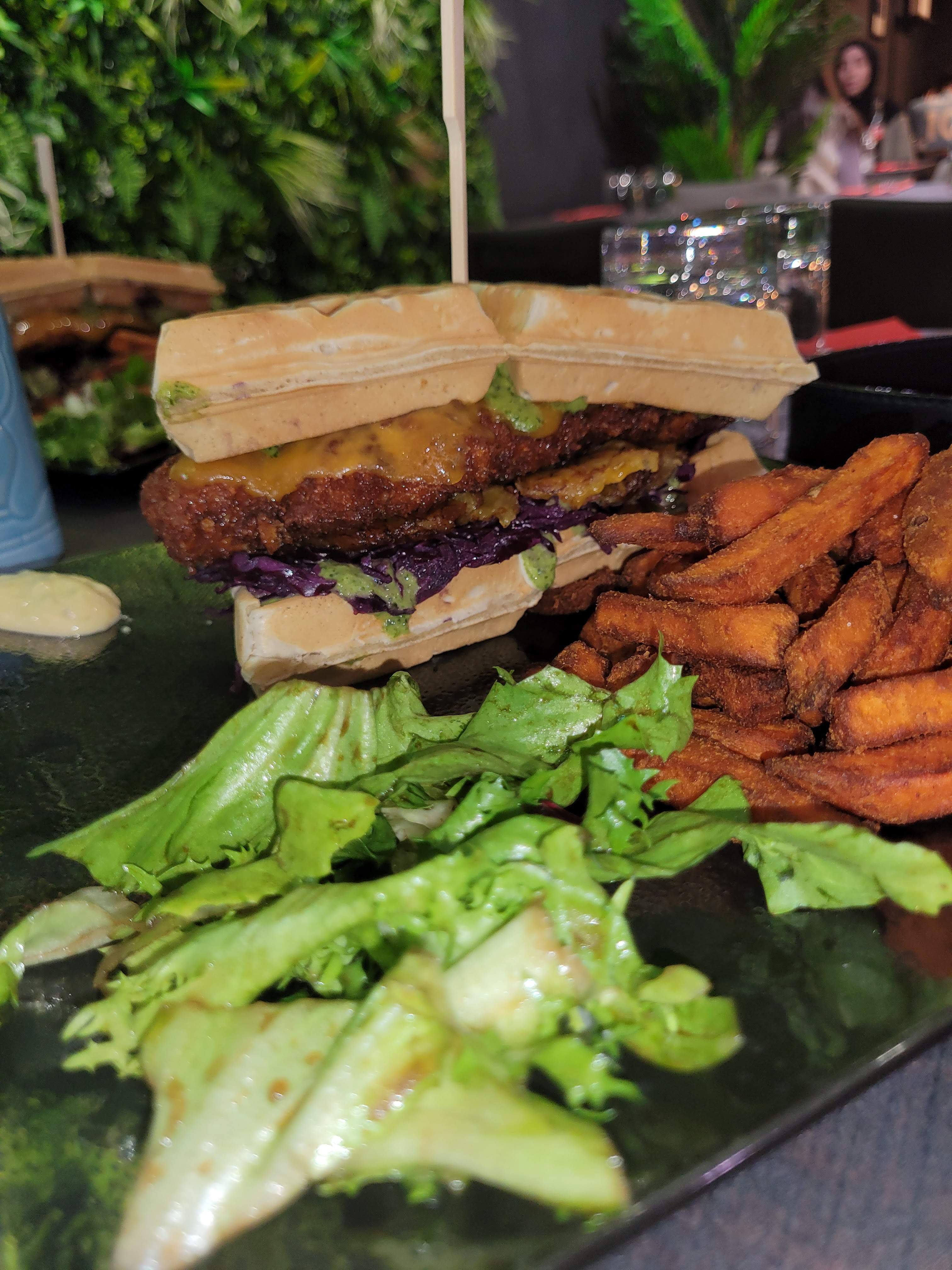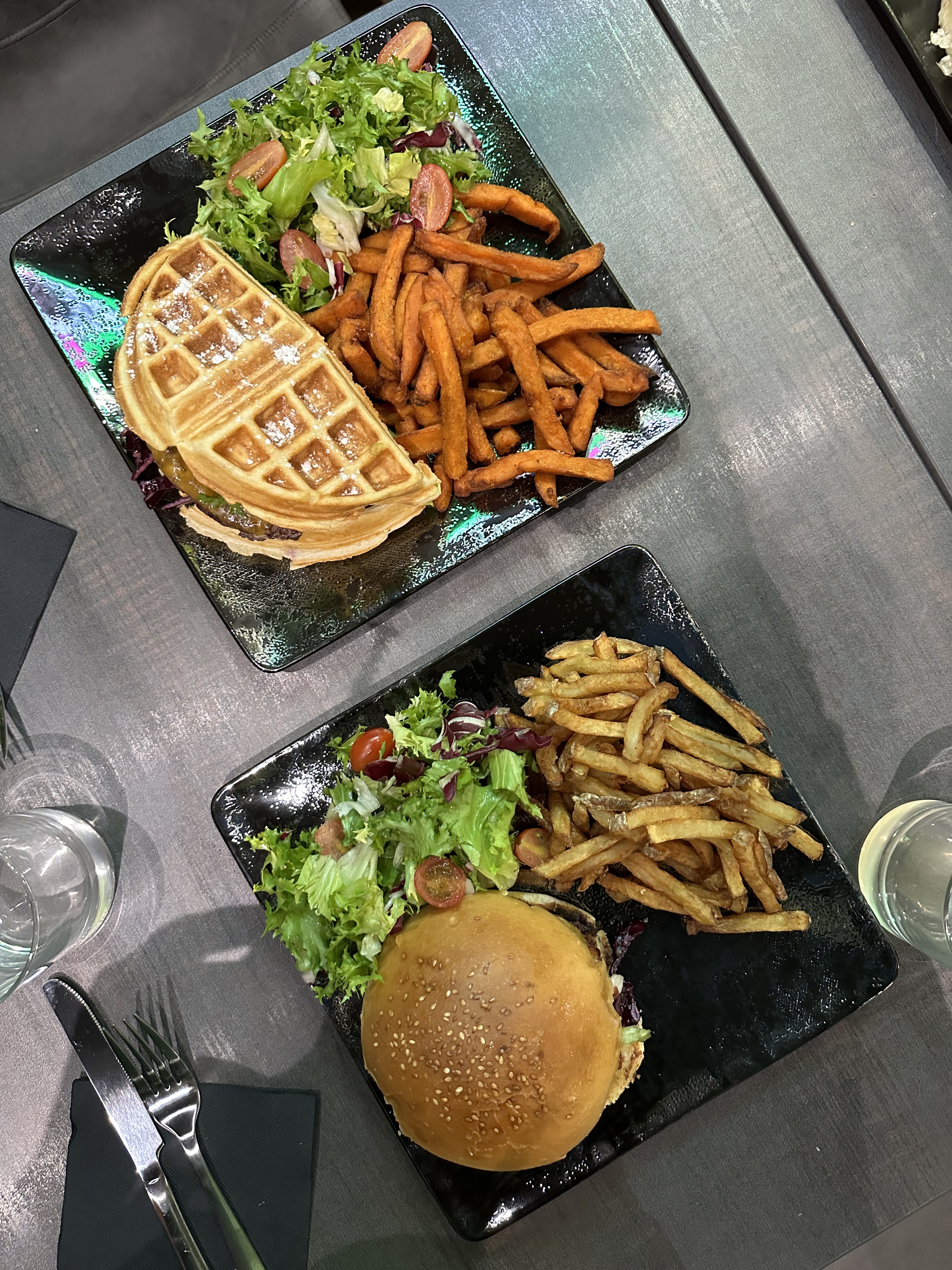Une très belle surprise d'avoir une gaufre salée qui sert de pain à burger ! J'ai pris l'option veggie et frites de patates douces. Je recommande c'était très bons 😉