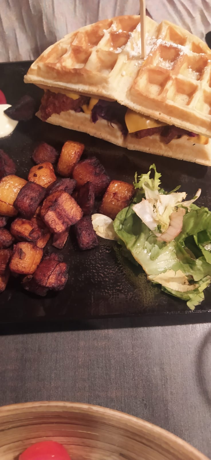 Un fast food rapide et efficace: j'ai bien apprécié le waffle burger lyonnais et sa sauce fromagère 👌🏻 Petite étoile en moins liée au fait que les bananes n'étaient pas plantains ce jour-là mais cuisinées façon plantain 😉