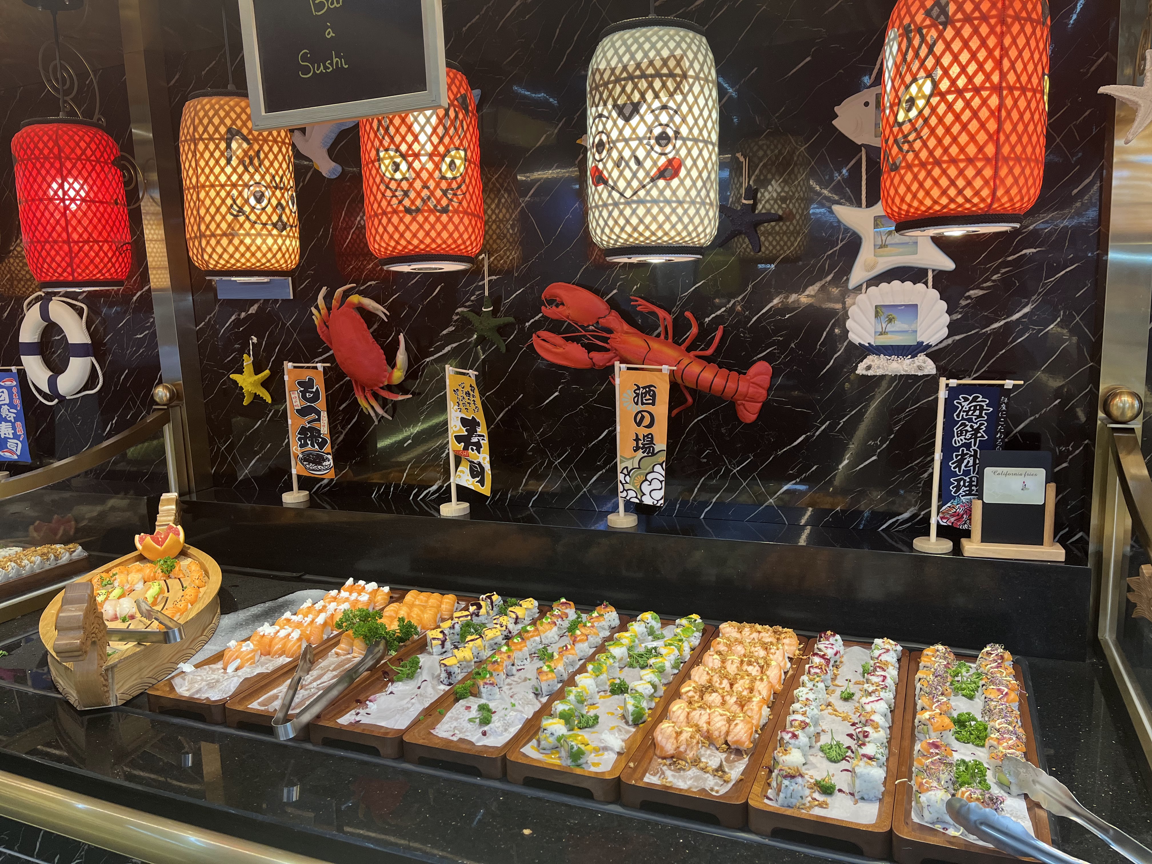 Très beau décor et un large choix de produits surtout au niveau des Sushis. Les fruits de mer sont frais. Les produits sont bons c’est un petit peu plus cher que les autres buffets à volonté mais le prix vaut sa qualité.