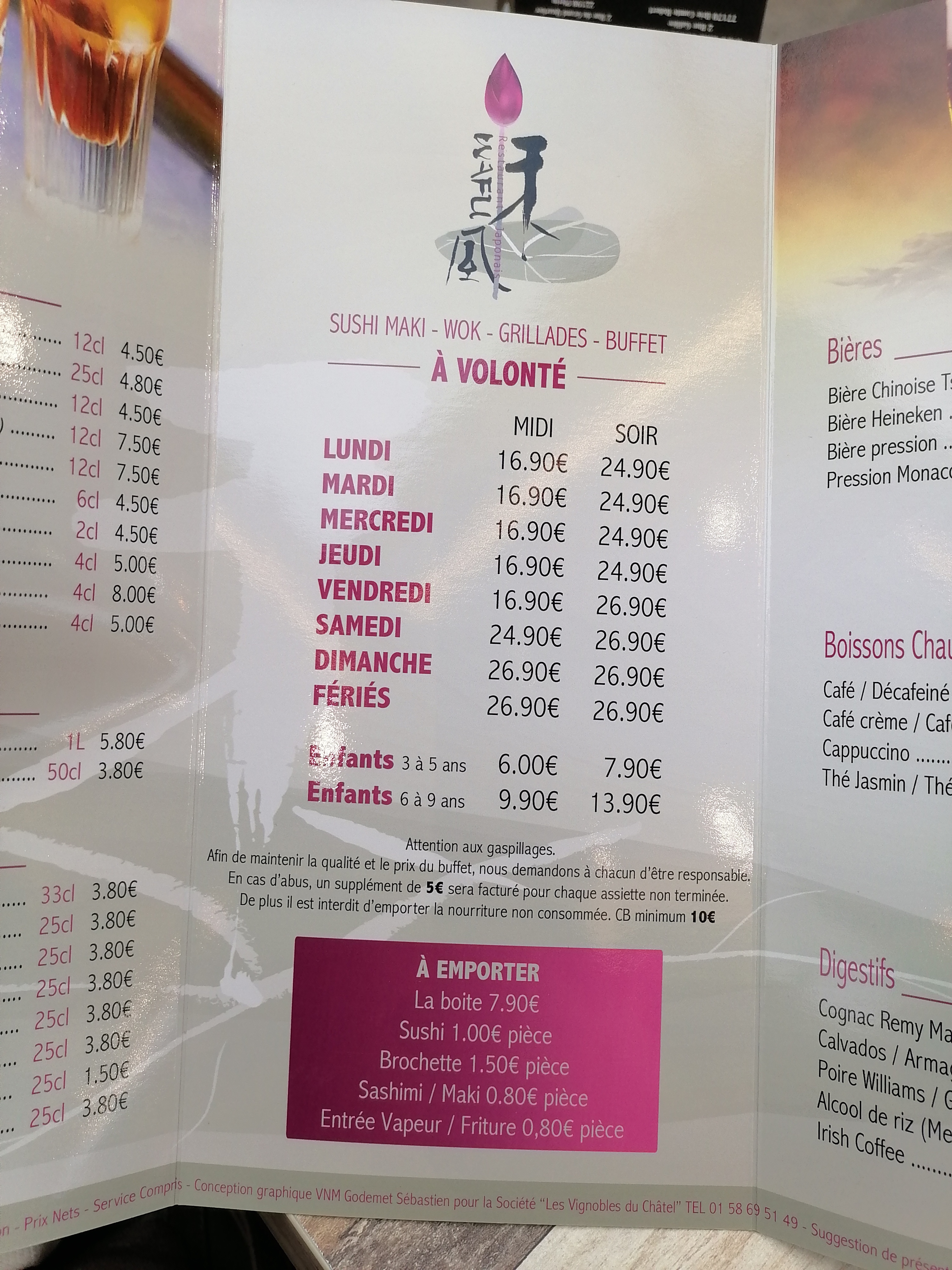 franchement le prix est trop cher pour une qualité très médiocre les fruits de mer étaient plein de glace les nems séchent les samoussas les aumoniéres en contre partie beau choix de sushis les crêmes dessert aucun goût pour le service il a fallu aller au bar pour demander une boisson il manquait un verre sur la table les gens à côté de nous eux pas de couteaux personnes ne passent pour ôter les assiettes sales pour le prix tout devrat être parfait les TOILETTES le carrelage des traces marron des traces de platre partout les cendriers dehors pas vidaient franchement nous faisons beaucoup de restaurants comme le vôtre dans toute la FRANCE je ne ferai pas de pub un serveur avait un jean pleins de taches j ai fais 10 ans de service en salle jamais avec une tenue sale les tables à côté de nous très mécontent aussi bonne chance pour la suite mais sens nous