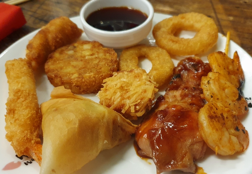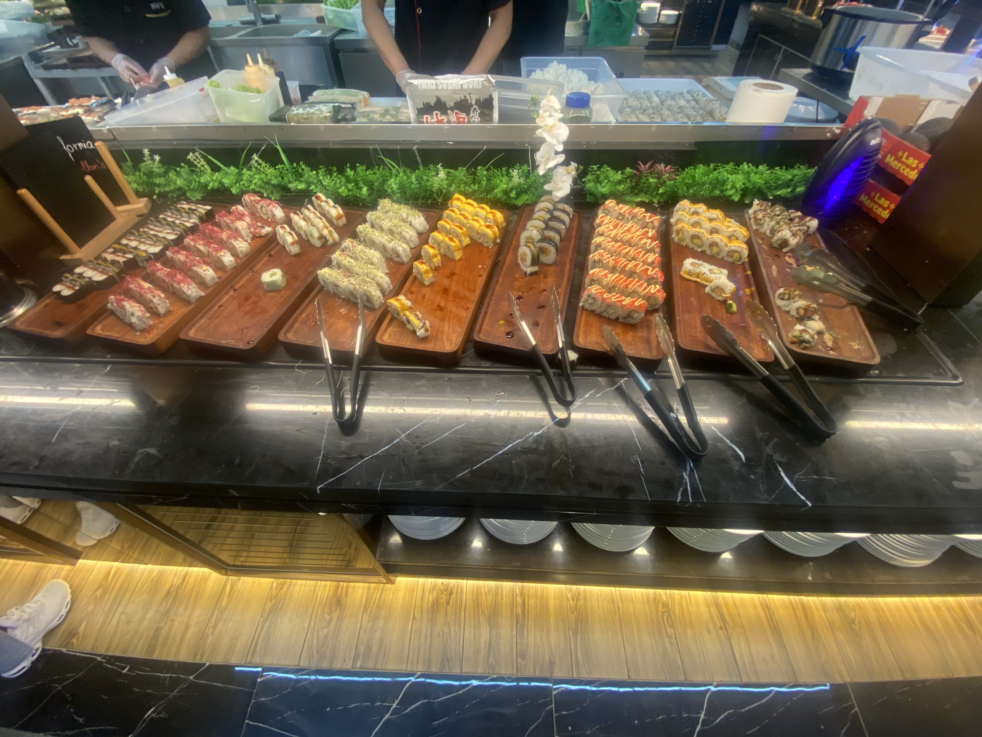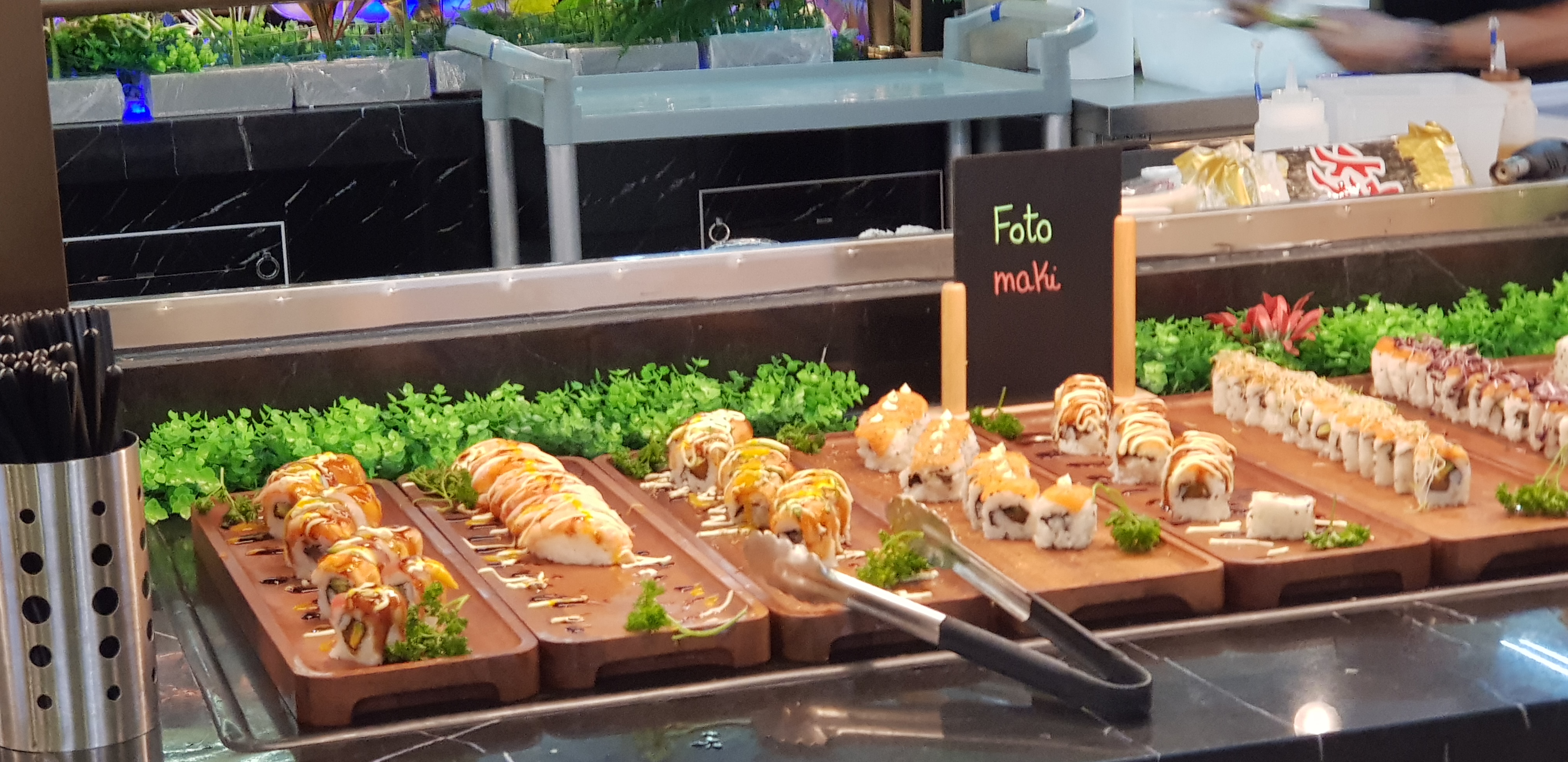 Ambiance très joyeuse, grande variété de plats, pour ceux qui non pas envie d'aller faire une queue pour cuire les brochettes, il y a-t-il un coin où les brochettes ils sont déjà cuit grande variété de sushi aussi ainsi que des maki