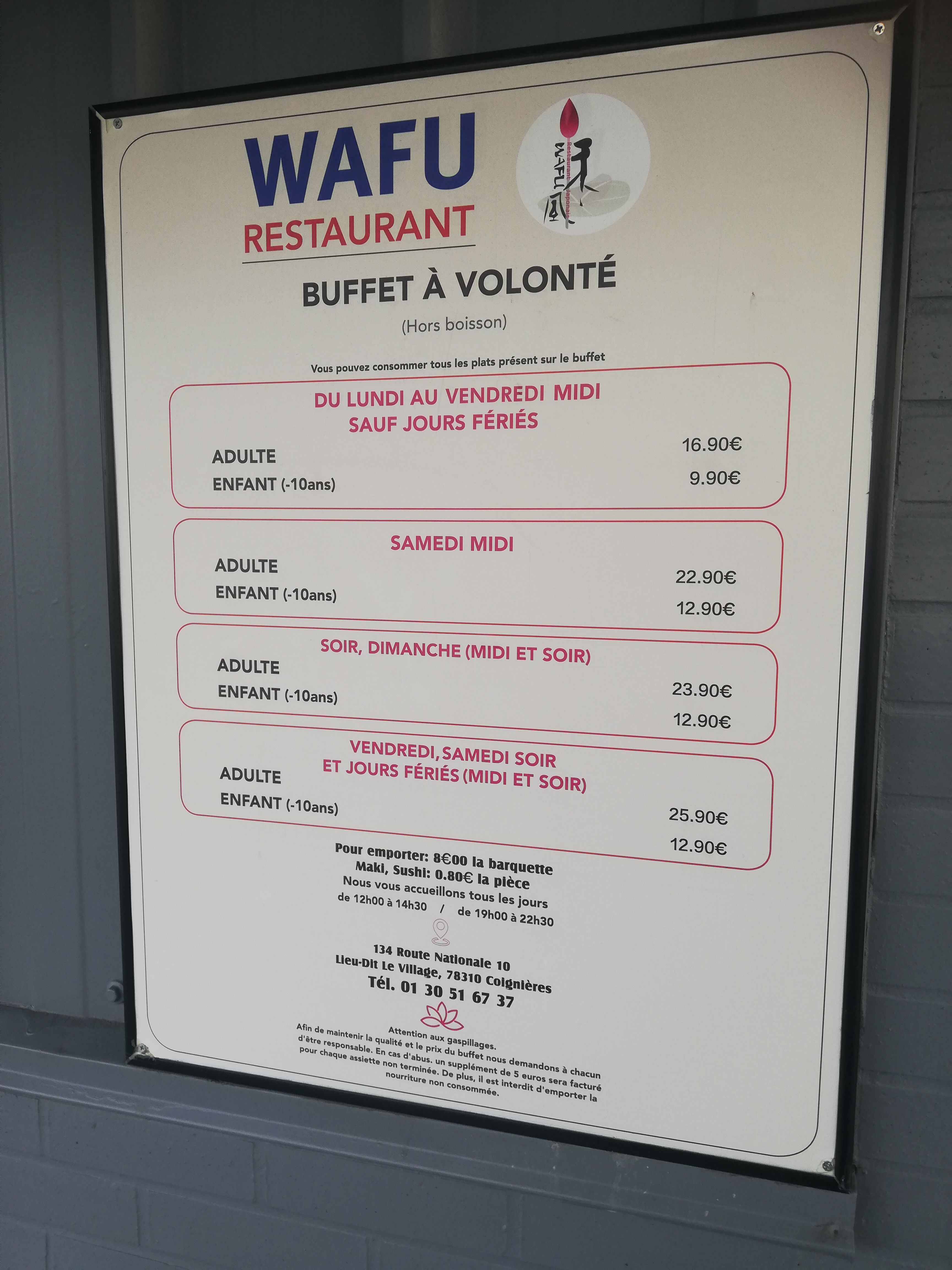 TROP TROP CHER!!! Hier soir, fête de la musique, j’ai emmené mes enfants 10 et 15 ans au Wafu Coignières. L’endroit est spacieux, semble propre et la décoration est plutôt sobre. La nourriture y est quantitative, pour la qualité allez ailleurs car nous avons goûté des boulettes qui ne semblaient pas de toute fraîcheur. L’ambiance est bruyante telle une cantine scolaire. Le personnel est aux aguets et cela est assez stressant car ils vous observent sans cesse et on ne se sent pas à l’aise. Après tout ceci, sachez que si vous y mangez le soir, le menu s’élève à presque 24€ par personne. Mon fils de 10 ans, qui n’a presque rien mangé est compté comme adulte…10 ANS!!!!!! Ajoutez à cela une ou deux boissons et vous frisez les 100€ pour de l’industriel réchauffé. Totalement INDÉCENT!!! WAFU, C’est terminé pour moi!