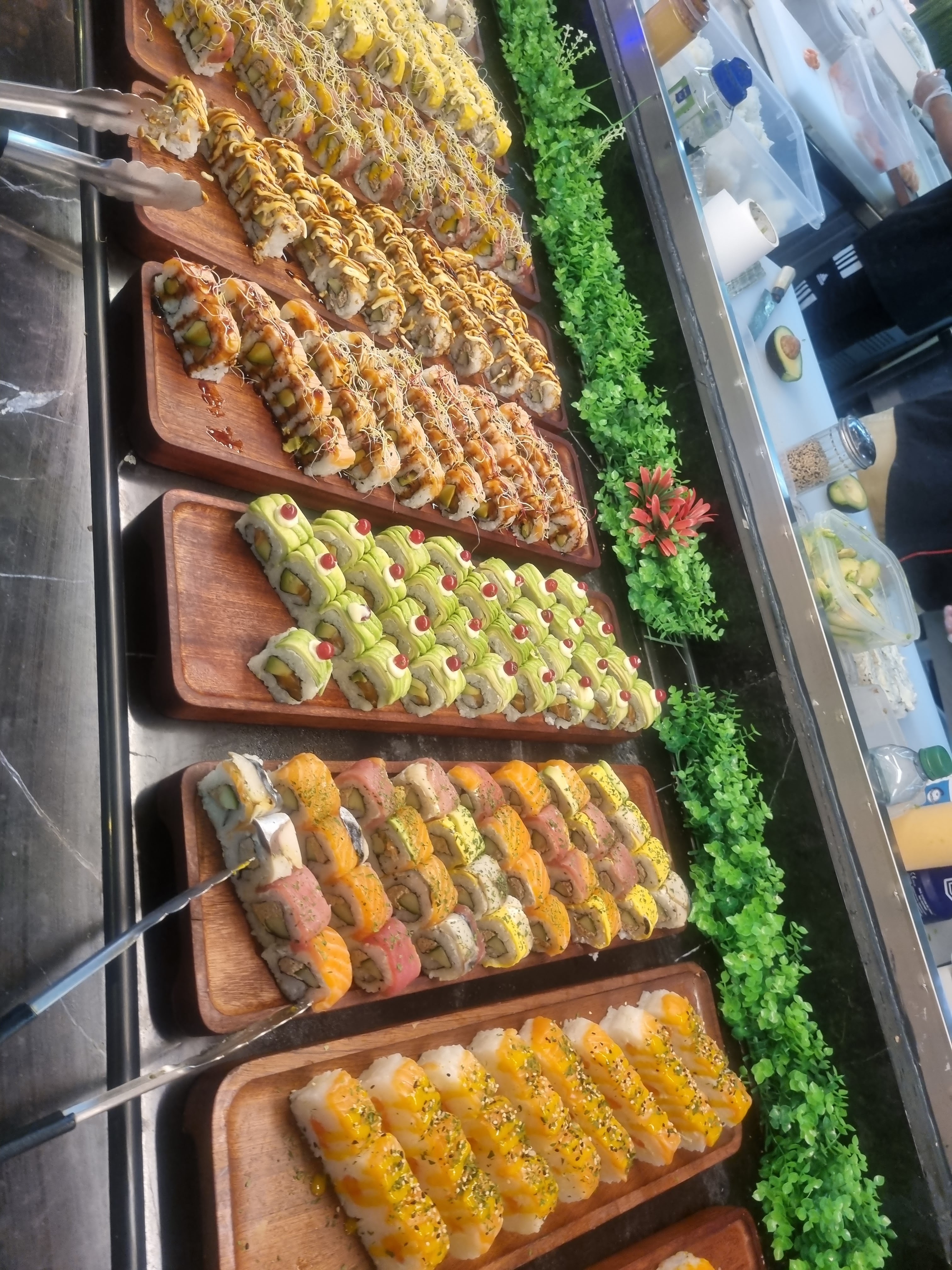 Un choix incroyable de l'entrée aux desserts. Les buffets sont remplis au fur et à mesure. Ne pas non plus arriver a la fermeture car les sushis sont faits devant vous ils pourraient ne plus en avoir.