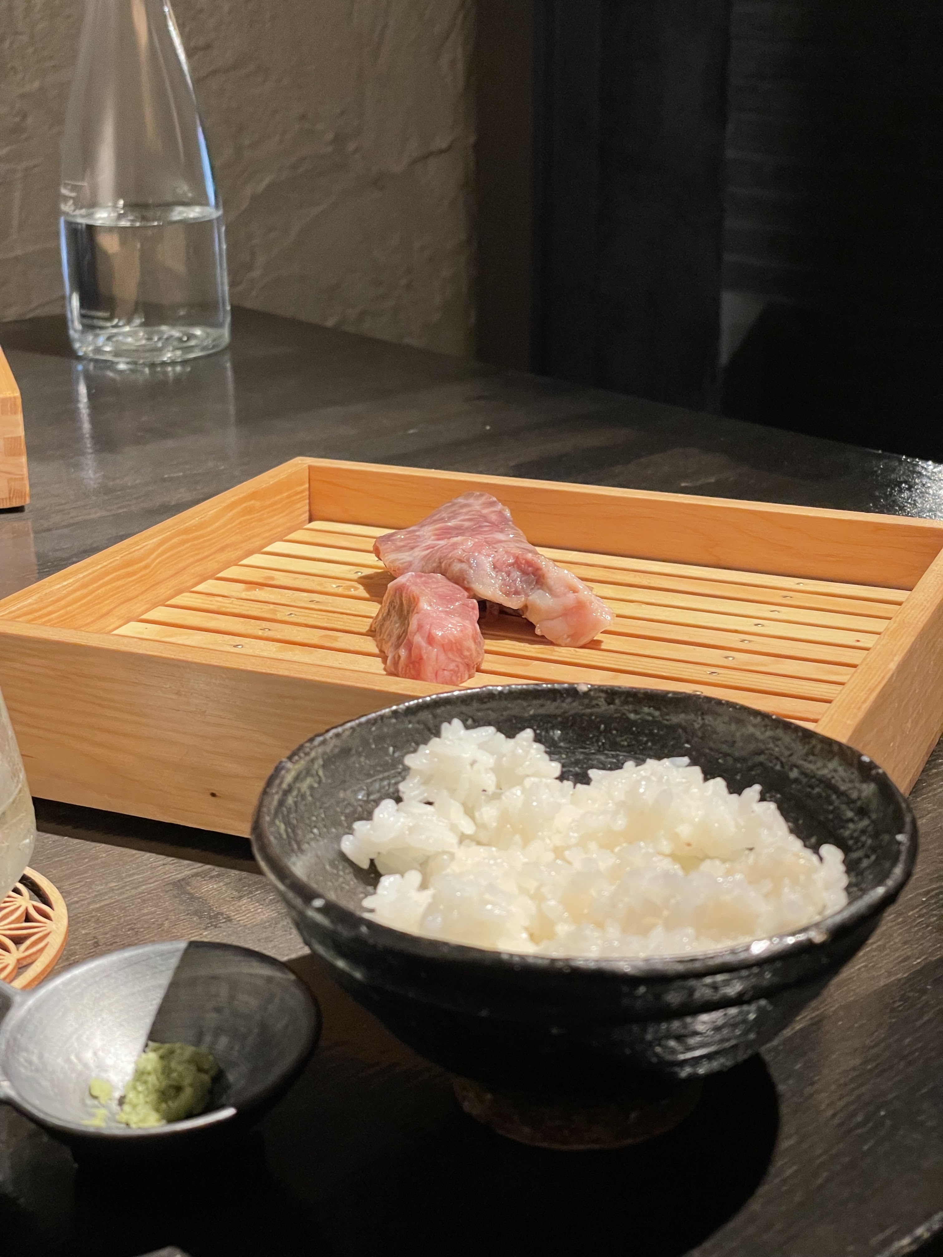 Restaurant très chic et classe. L'ambiance sombre et froide, met dans l'ambiance rapidement. Les hôtesses d'accueil, élégantes et gracieuses sont très attentives à vos moindres désirs. Elles sont rapides, efficaces et d'une amabilité à toute épreuve. Les menus ne sont pas très étoffés et vous n'aurez que le choix des parties du bœuf wagyu. Nous avons opté pour le menu take qui propose du faux filet et de l'entrecôte pour 60 euros de plus que l'ume. Mais à ce prix vous n'aurez qu'une tranche extrêmement fine de chacune de ces parties, donc un peu déçus. Par contre, n'hésitez pas à goûter leurs excellents sakés, les hôtesses sont de très bons conseils et sauront trouvé celui qui ravira vos papilles. Servis dans des services en bois d'hinoki selon leur coutumes.