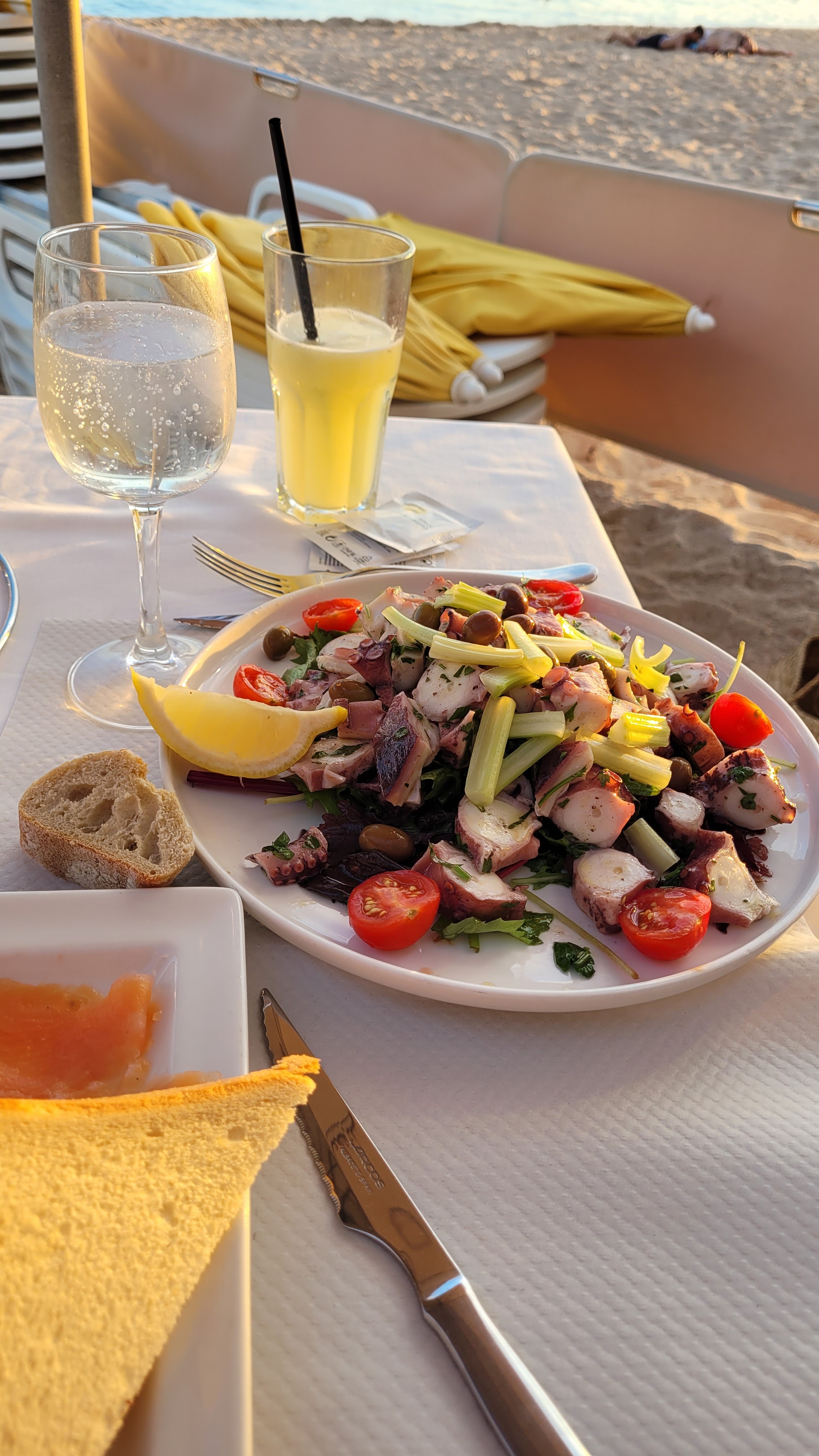 Parlons d'abord du positif. La plage est très facilement reconnaissable grâce aux affreux parasols jaunes. Ce fut bref mais passons au négatif. Tout d'abord la plage est très laide(parasols faisant tâche dans le paysage), la plage est plutôt mal fréquentée et le bruit lui est incessant, l'accueil fût plus que moyen et le personnel ne s'intéresse à vous uniquement pour vous faire consommer et au moment de payer, demander un verre d'eau est-il considéré comme crime dans votre restaurant ? Car votre nonchalance à la moindre demande est plutôt mal venu lorsque vous faites payer 20€ d'entrée et un tartare à 19€ qui était tout sauf de la viande (je n'avais jamais mangé rien de tel avant). Je déconseille fortement.