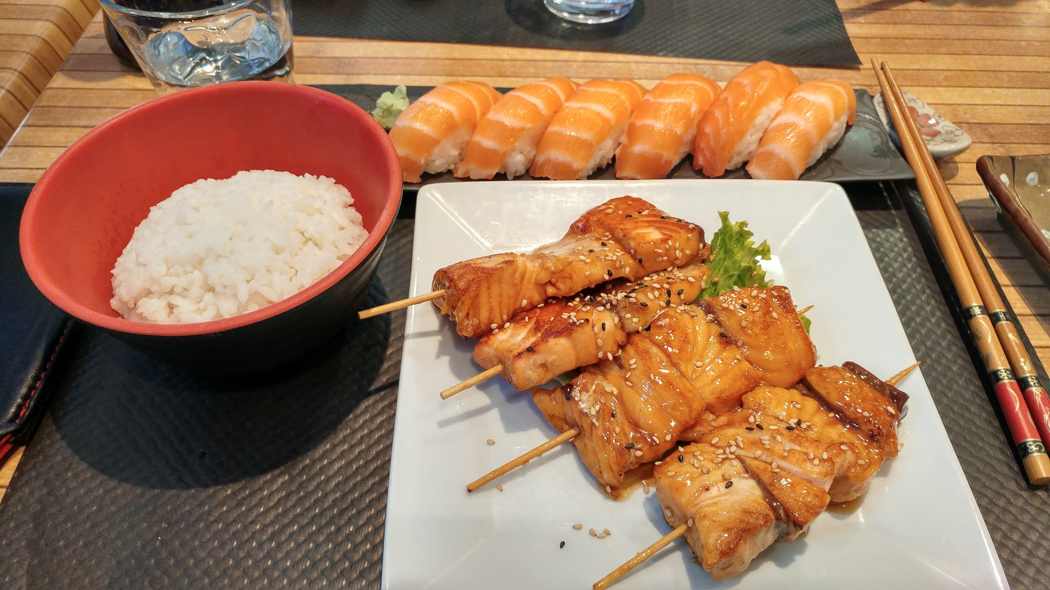 Excellentes brochettes de saumon (juteuses à l'intérieur et caramélisées à l'extérieur). En revanche, les sushis sont trop peu fournis en poisson et la cuisson du riz est mal maîtrisée... Si vous réservez sur Lafourchette, le personnel vous demandera d'annuler votre réservation sous prétexte que ça leur coûte de l'argent... Sans commentaire.