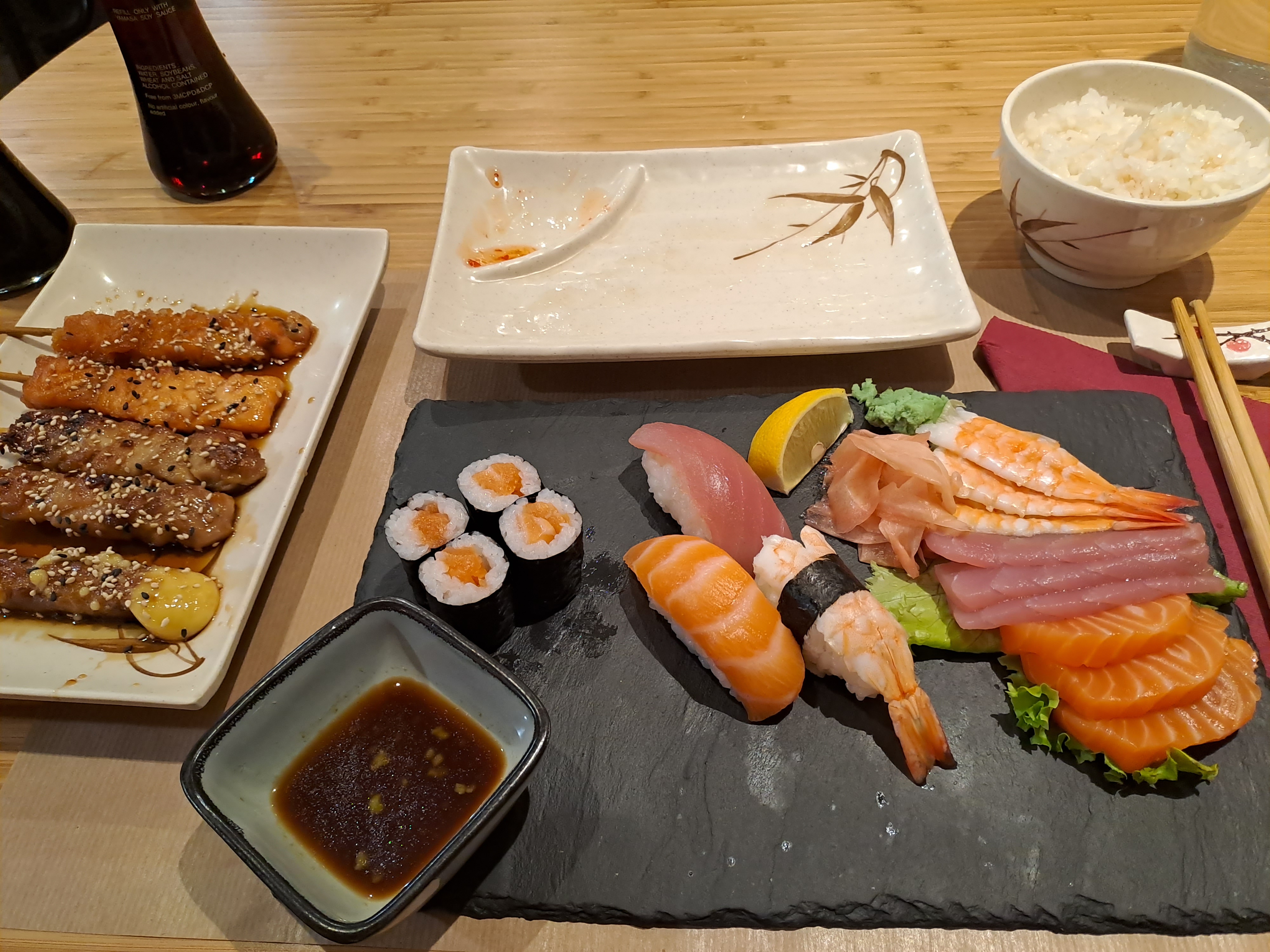 Le poisson ne semblait pas du tout frais surtout le thon. Le riz n'est pas très bon et les brochettes aux gambas sont des brochettes aux crevettes en réalité. Ce n'est pas mauvais mais cela ne mérite certainement pas la moyenne de 4,4.