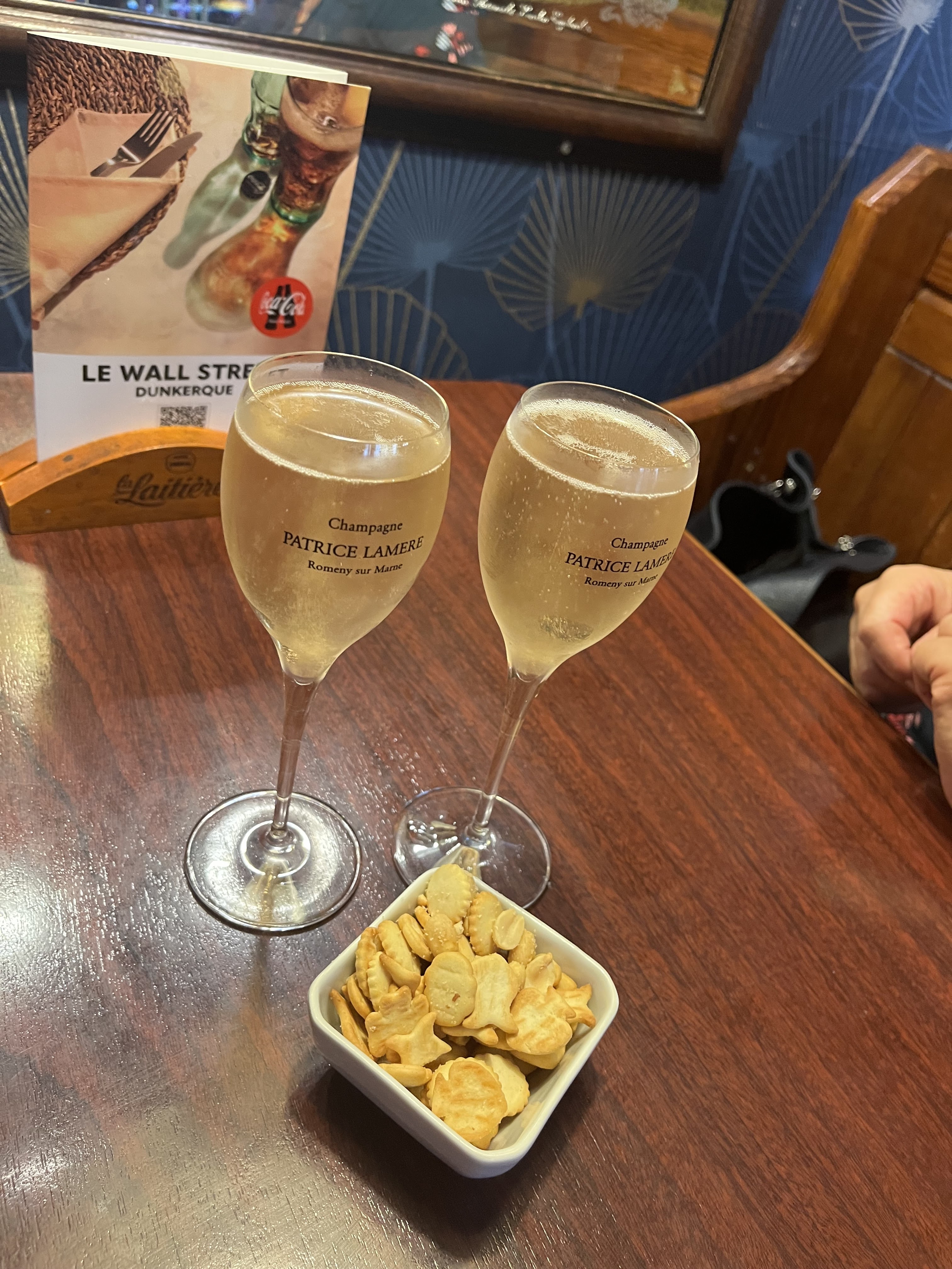 Troisième escale à Dunkerque, il était temps de revenir au Wall Street Pub goûter les excellentes Saint-Jacques, charnues à souhait ! Après un apéro Picon, quelques verres de muscadet se sont plaisamment accordés aux Saint-Jacques. Des craquants trois chocolats pour finir en beauté. Et toujours les bons mots du patron...